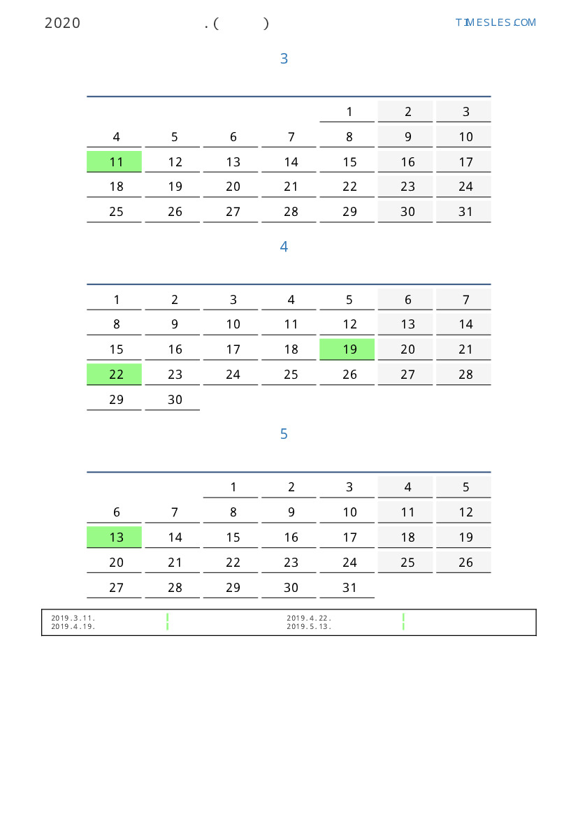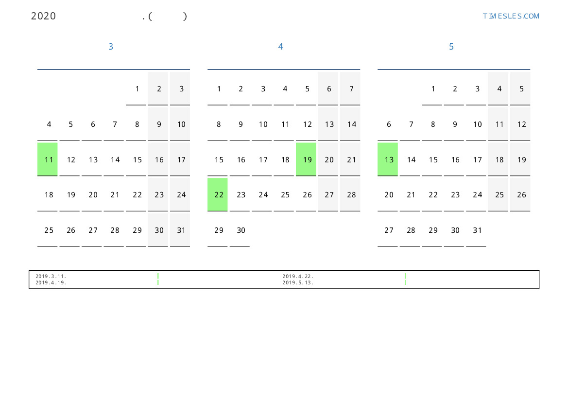 투발루 2019 년 봄을 위해 공휴일 및 주말이 포함 된 PDF 캘린더 다운로드 및 인쇄