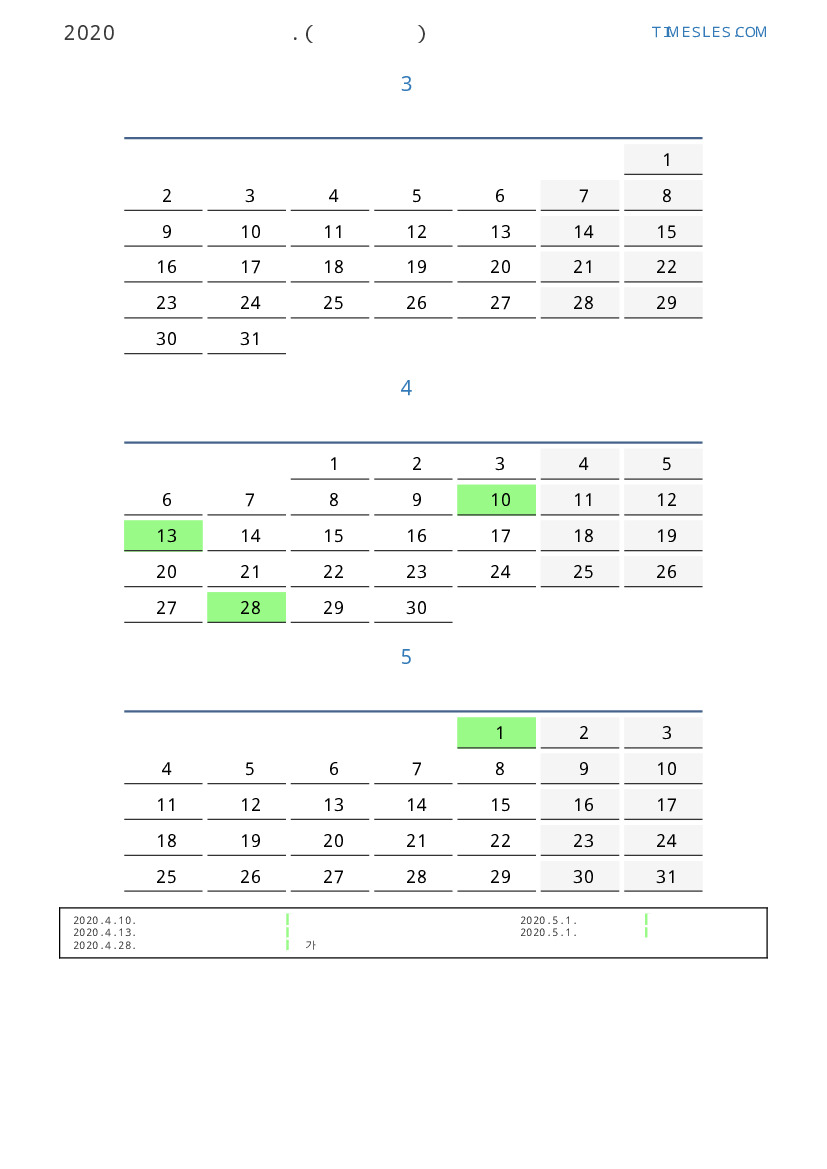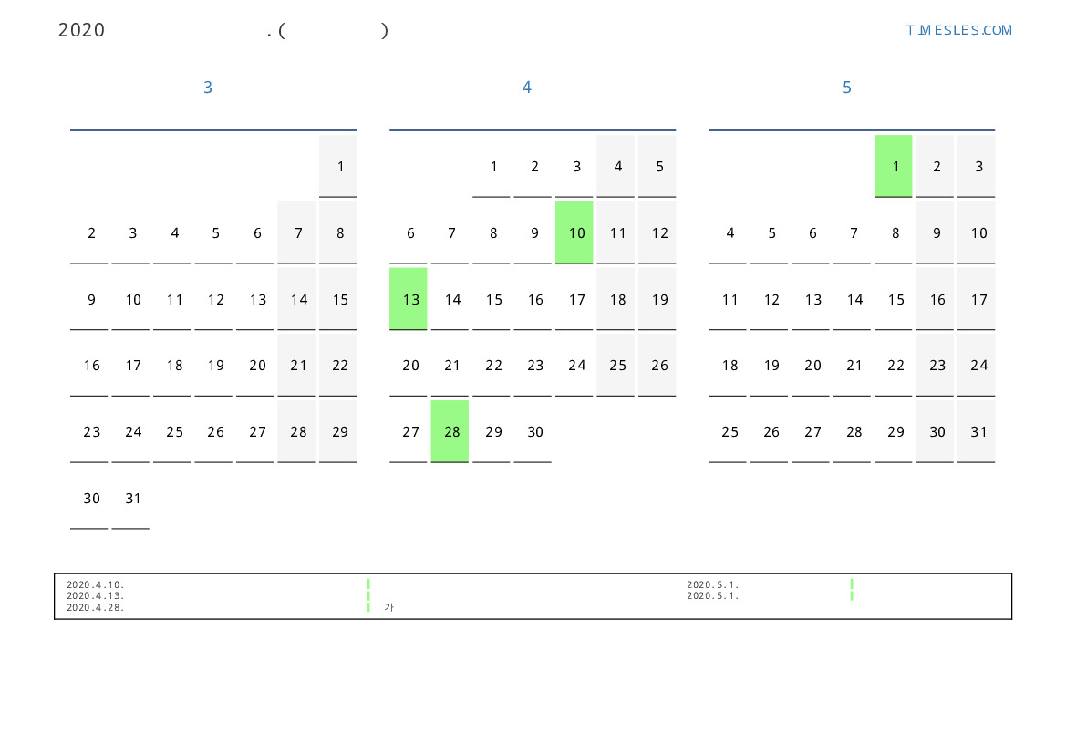 연휴가있는 계절별 세로 달력