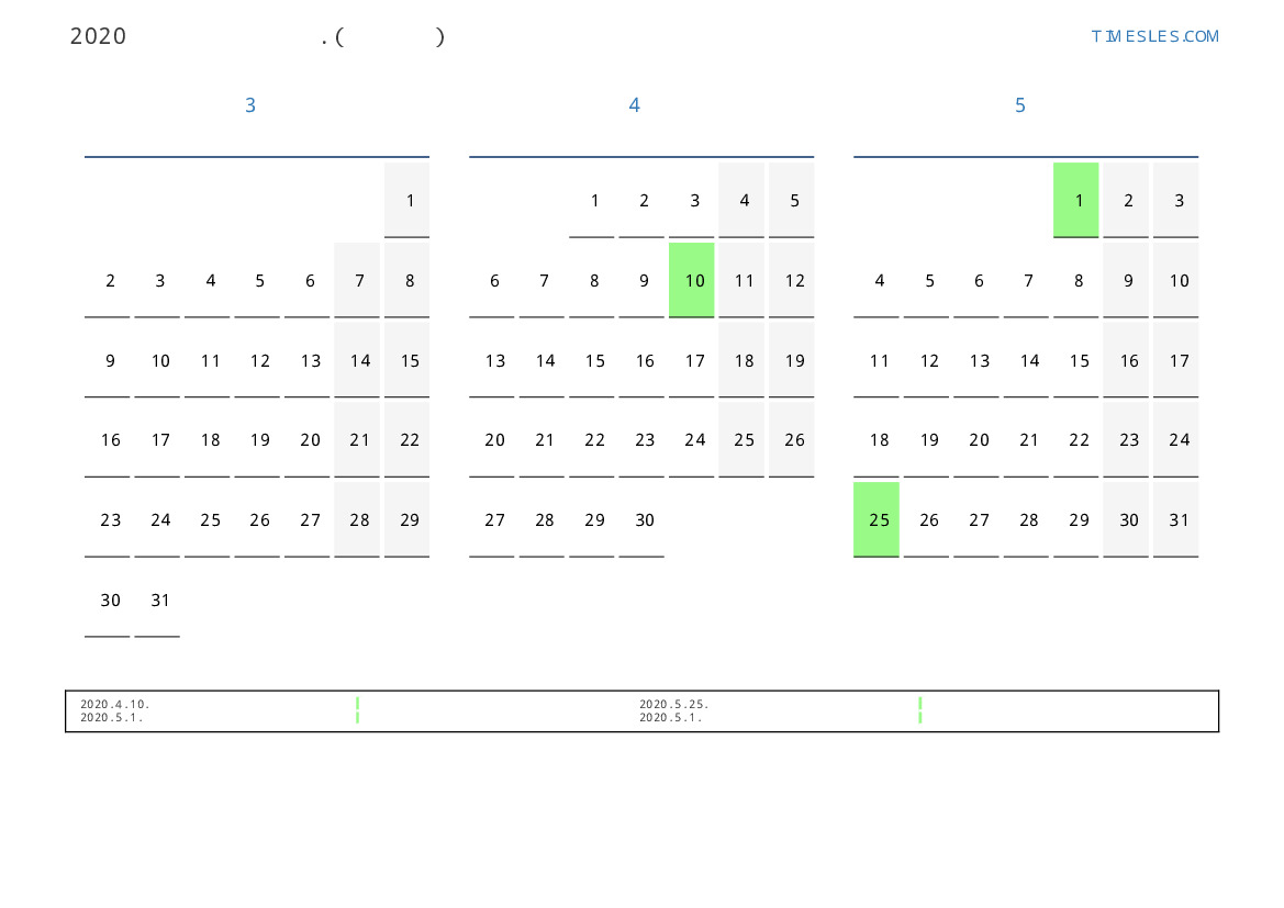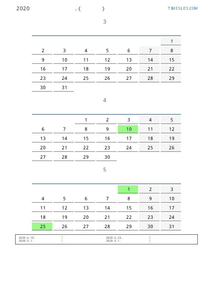 에콰도르 2020 년 봄을 위해 공휴일 및 주말이 포함 된 PDF 캘린더 다운로드 및 인쇄