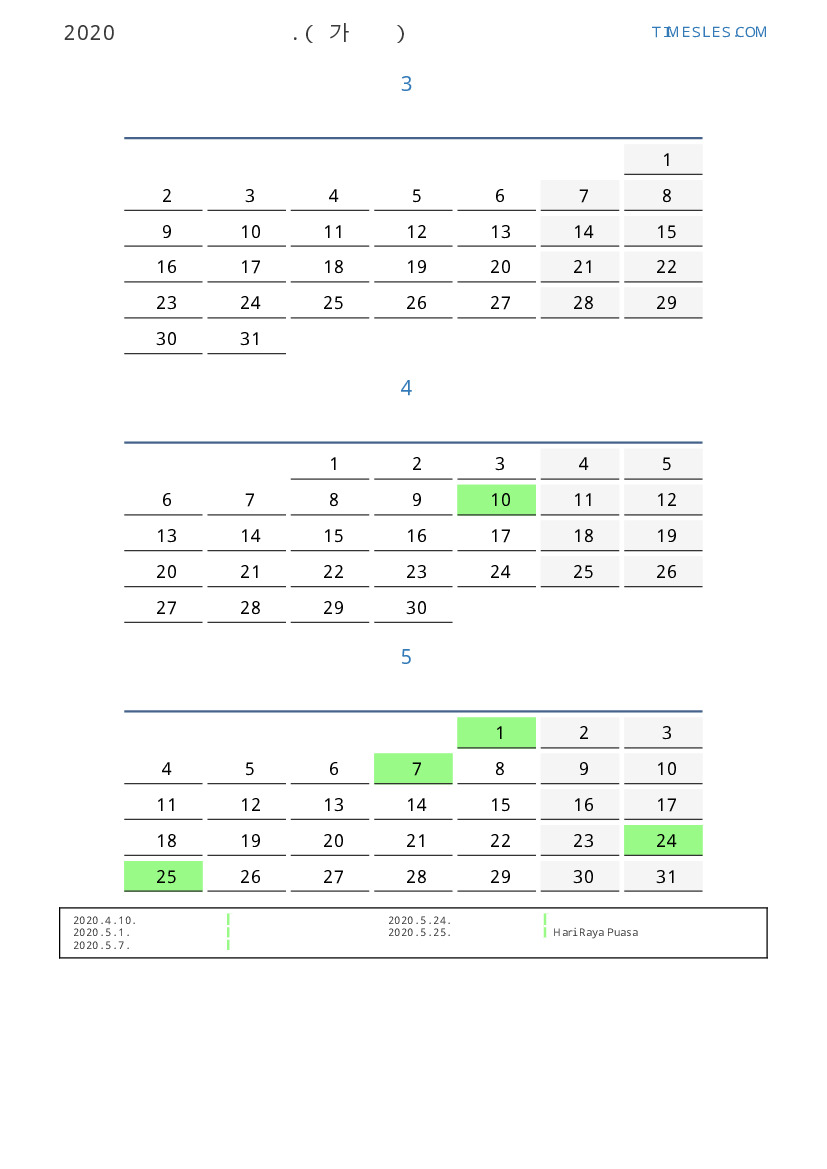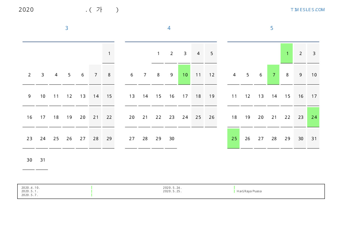 싱가포르 2020 년 봄을 위해 공휴일 및 주말이 포함 된 PDF 캘린더 다운로드 및 인쇄