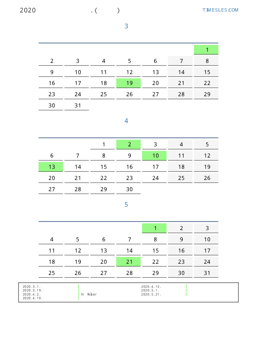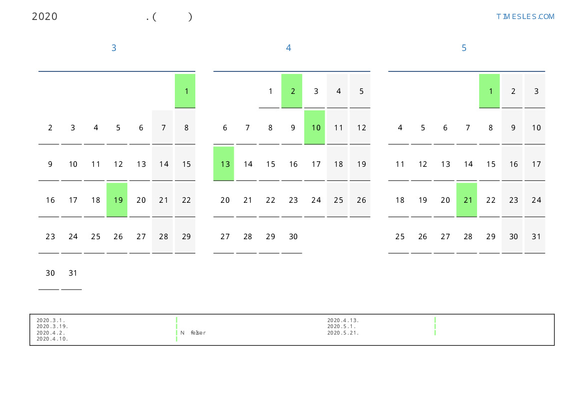 스위스 2020 년 봄을 위해 공휴일 및 주말이 포함 된 PDF 캘린더 다운로드 및 인쇄