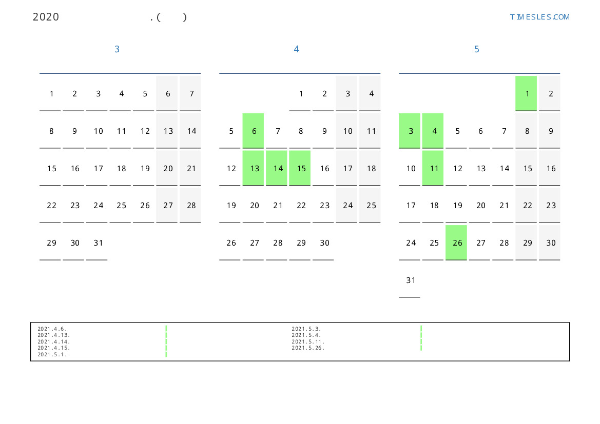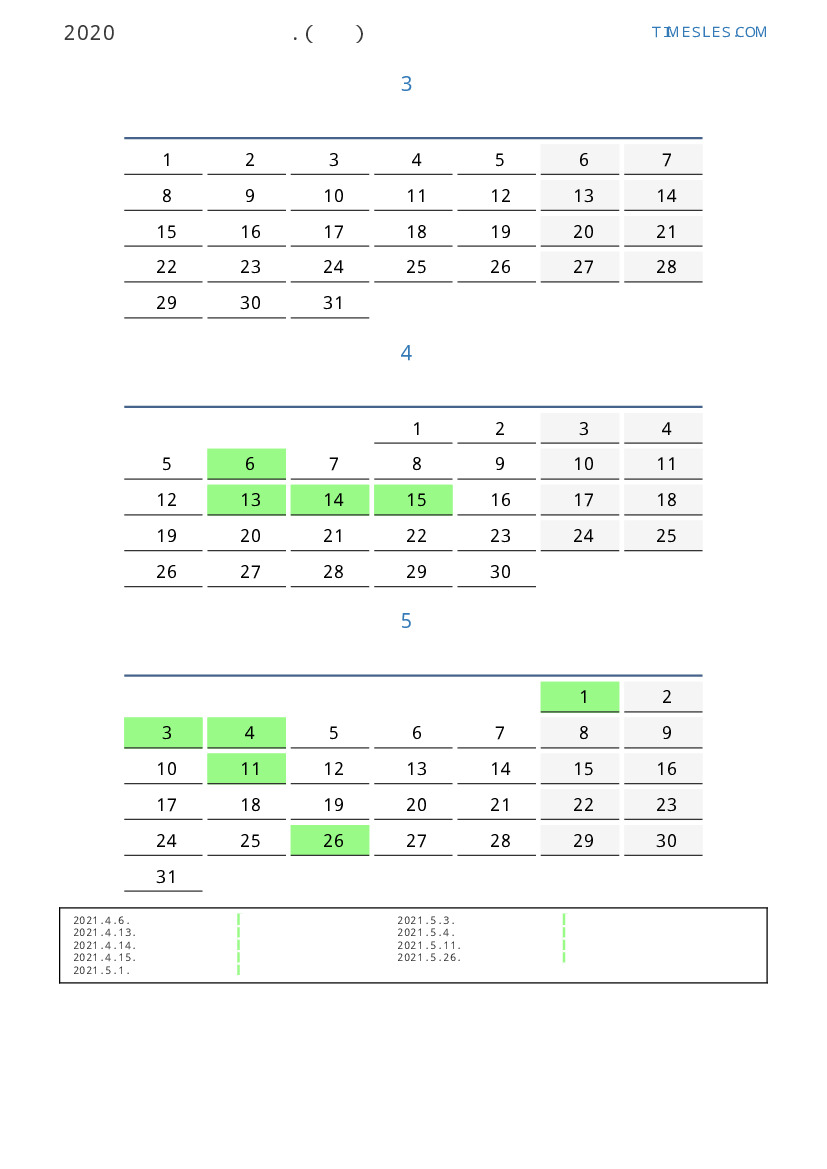 태국 2021 년 봄을 위해 공휴일 및 주말이 포함 된 PDF 캘린더 다운로드 및 인쇄