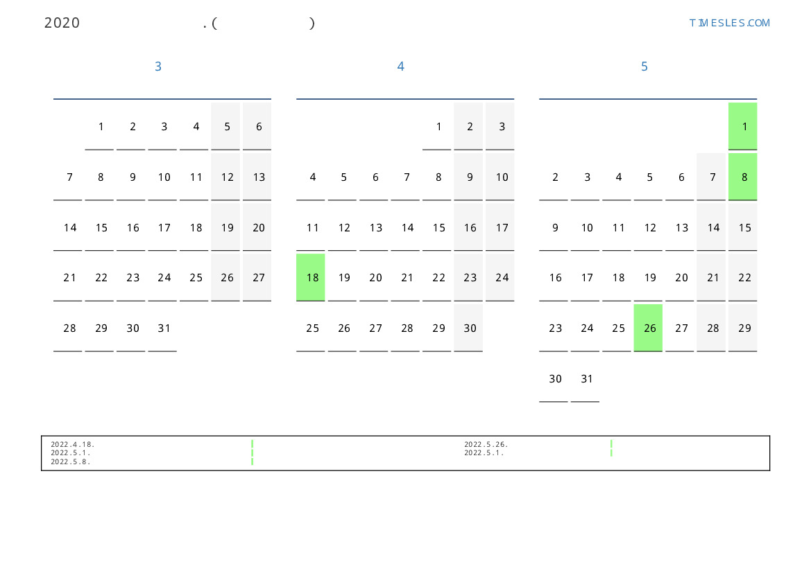 뉴 칼레도니아 2022 년 봄을 위해 공휴일 및 주말이 포함 된 PDF 캘린더 다운로드 및 인쇄