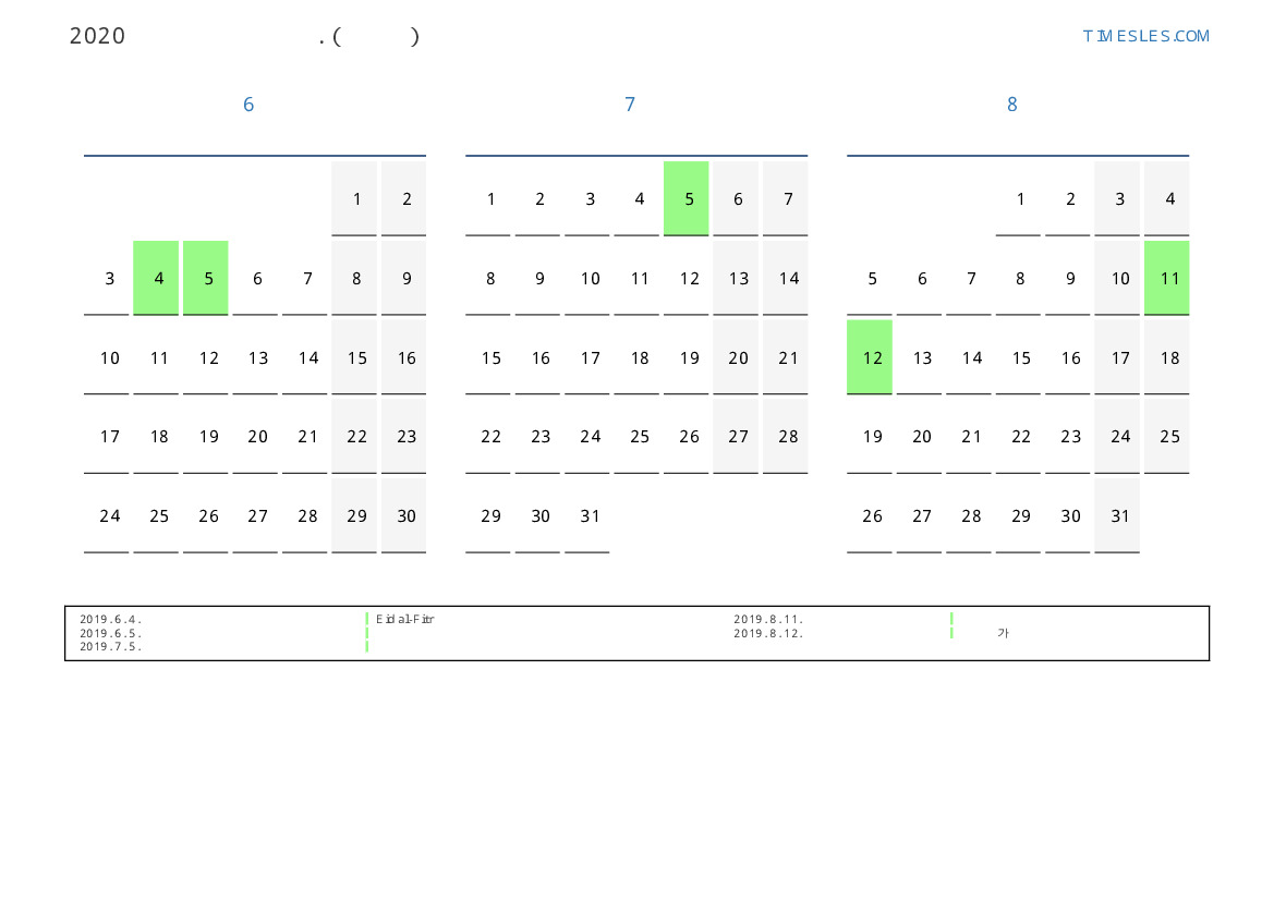 알제리 2019 년 여름 동안 공휴일 및 주말이 포함 된 PDF 캘린더 다운로드 및 인쇄