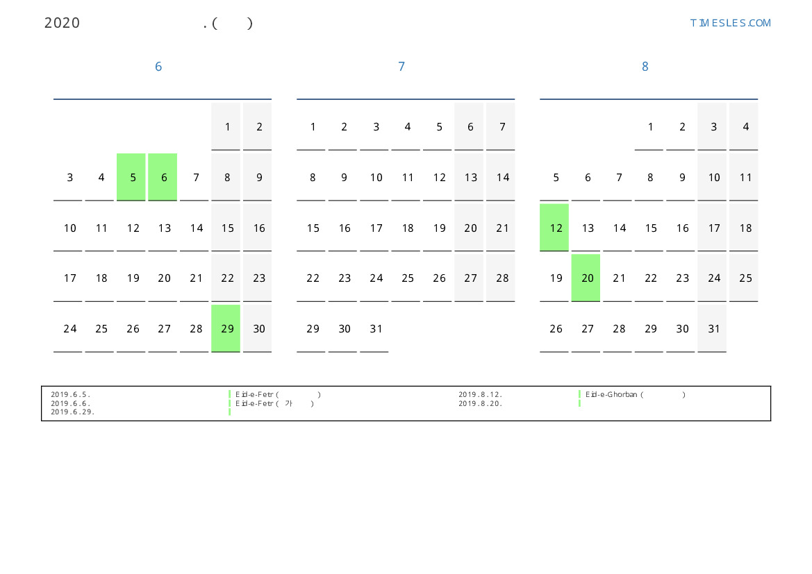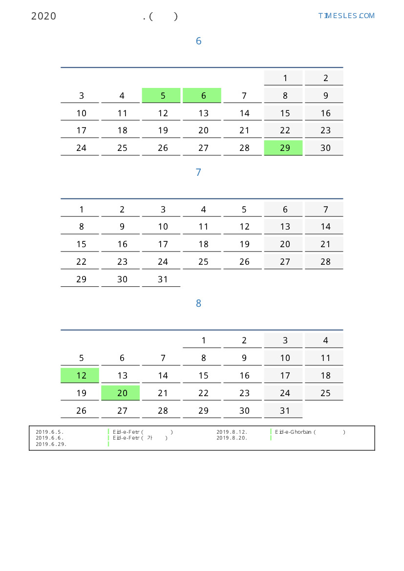 이란 2019 년 여름 동안 공휴일 및 주말이 포함 된 PDF 캘린더 다운로드 및 인쇄