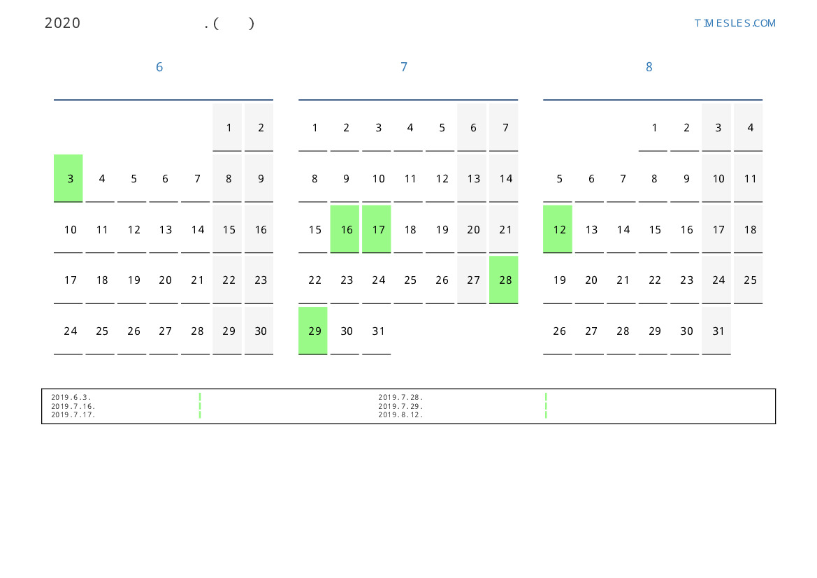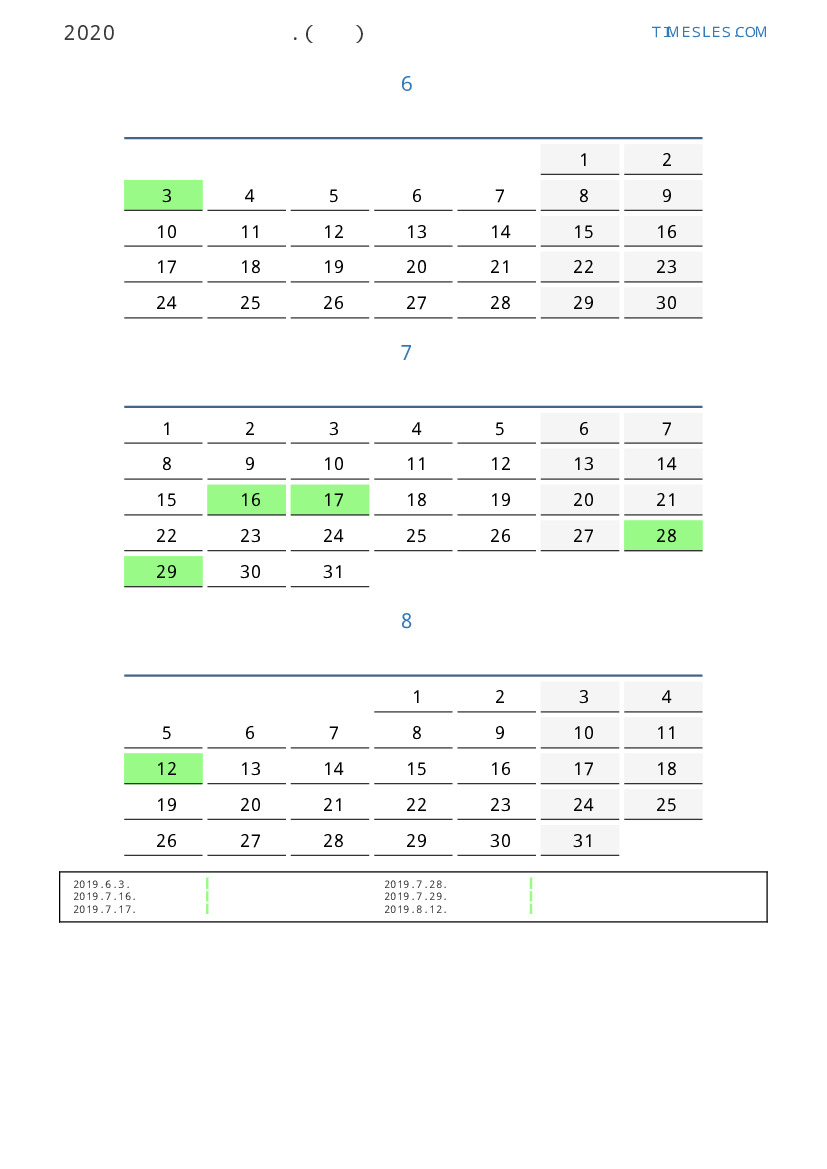 태국 2019 년 여름 동안 공휴일 및 주말이 포함 된 PDF 캘린더 다운로드 및 인쇄