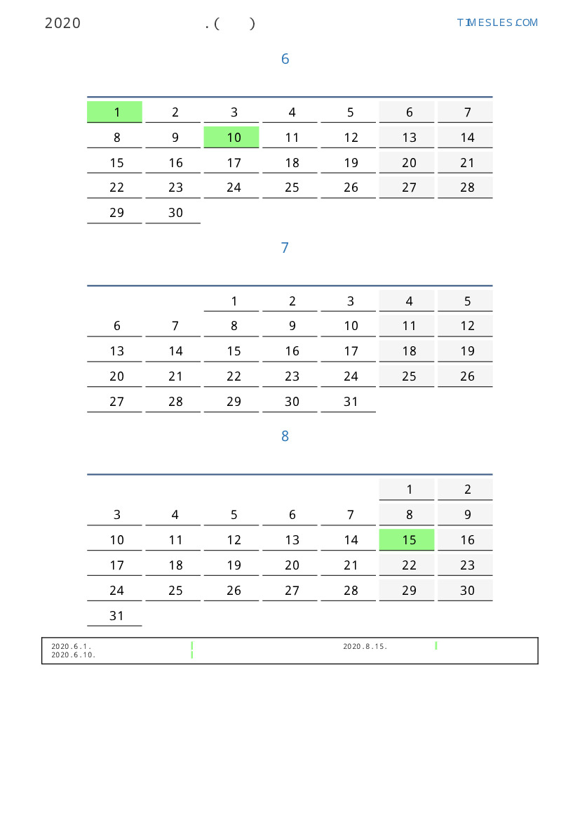 콩고 2020 년 여름 동안 공휴일 및 주말이 포함 된 PDF 캘린더 다운로드 및 인쇄