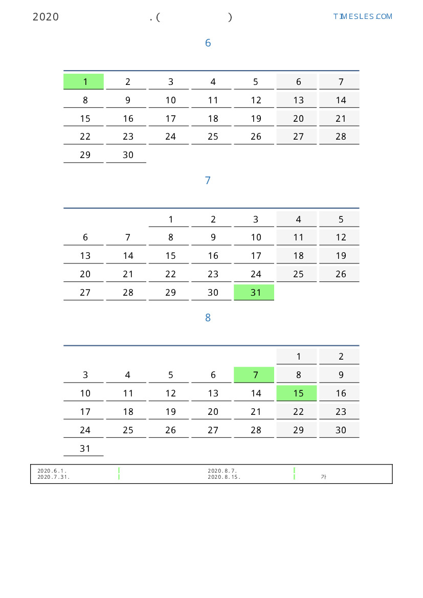 코트 디부 아르 2020 년 여름 동안 공휴일 및 주말이 포함 된 PDF 캘린더 다운로드 및 인쇄