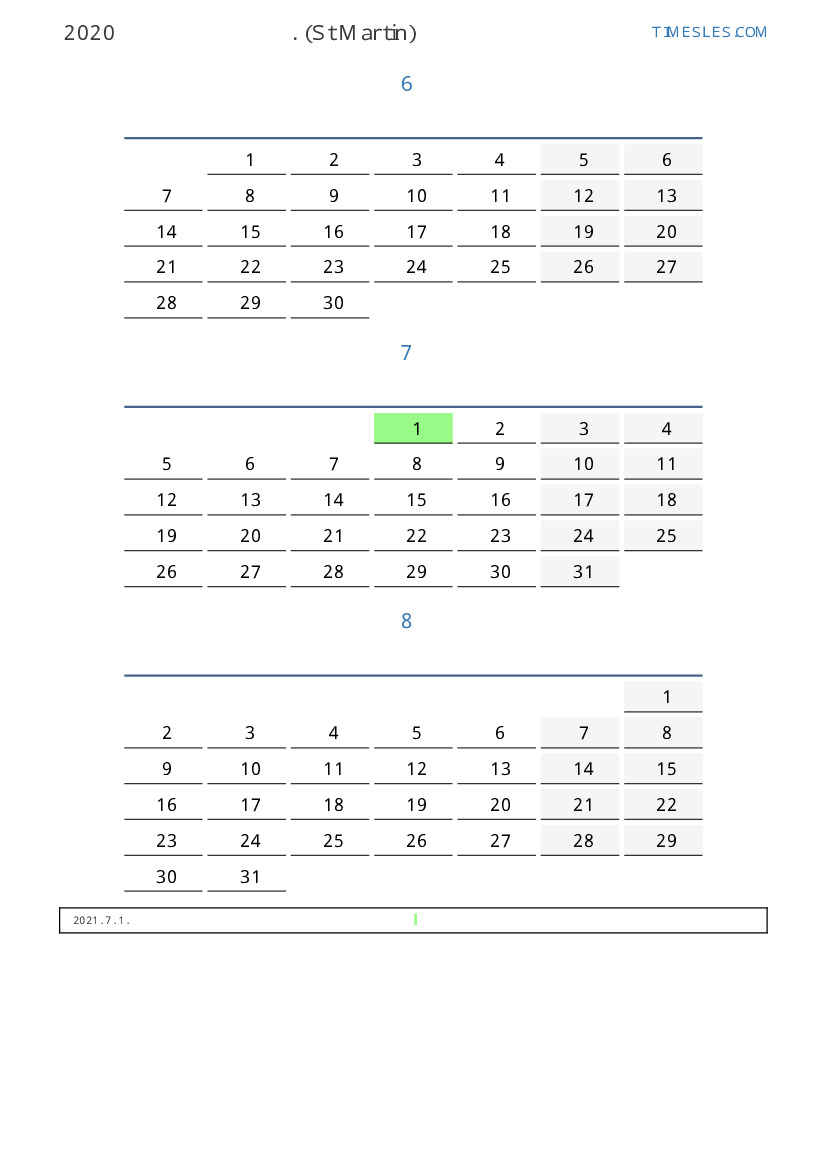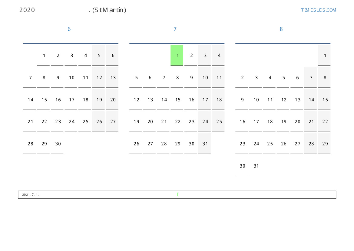 신트 마르 턴 2021 년 여름 동안 공휴일 및 주말이 포함 된 PDF 캘린더 다운로드 및 인쇄