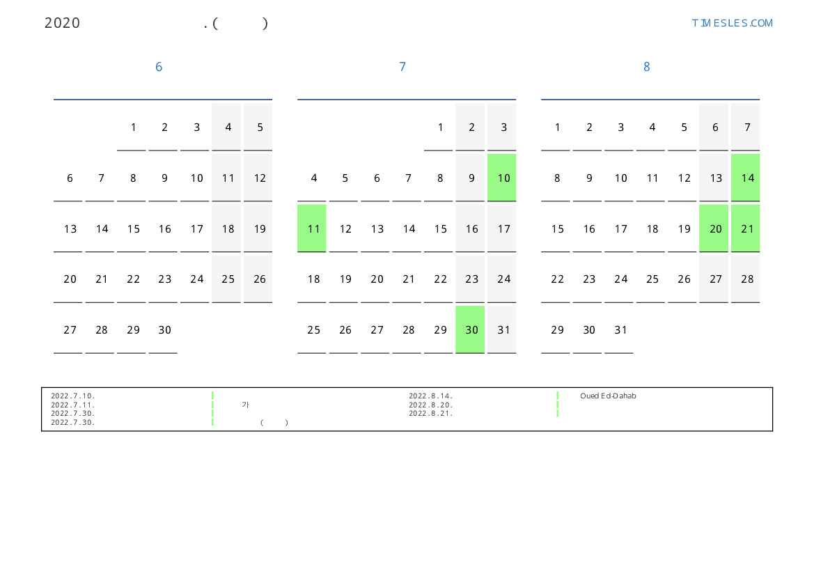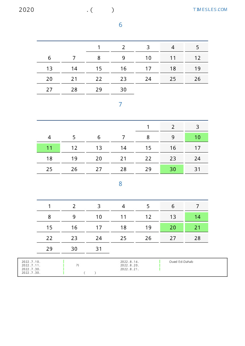 모로코 2022 년 여름 동안 공휴일 및 주말이 포함 된 PDF 캘린더 다운로드 및 인쇄