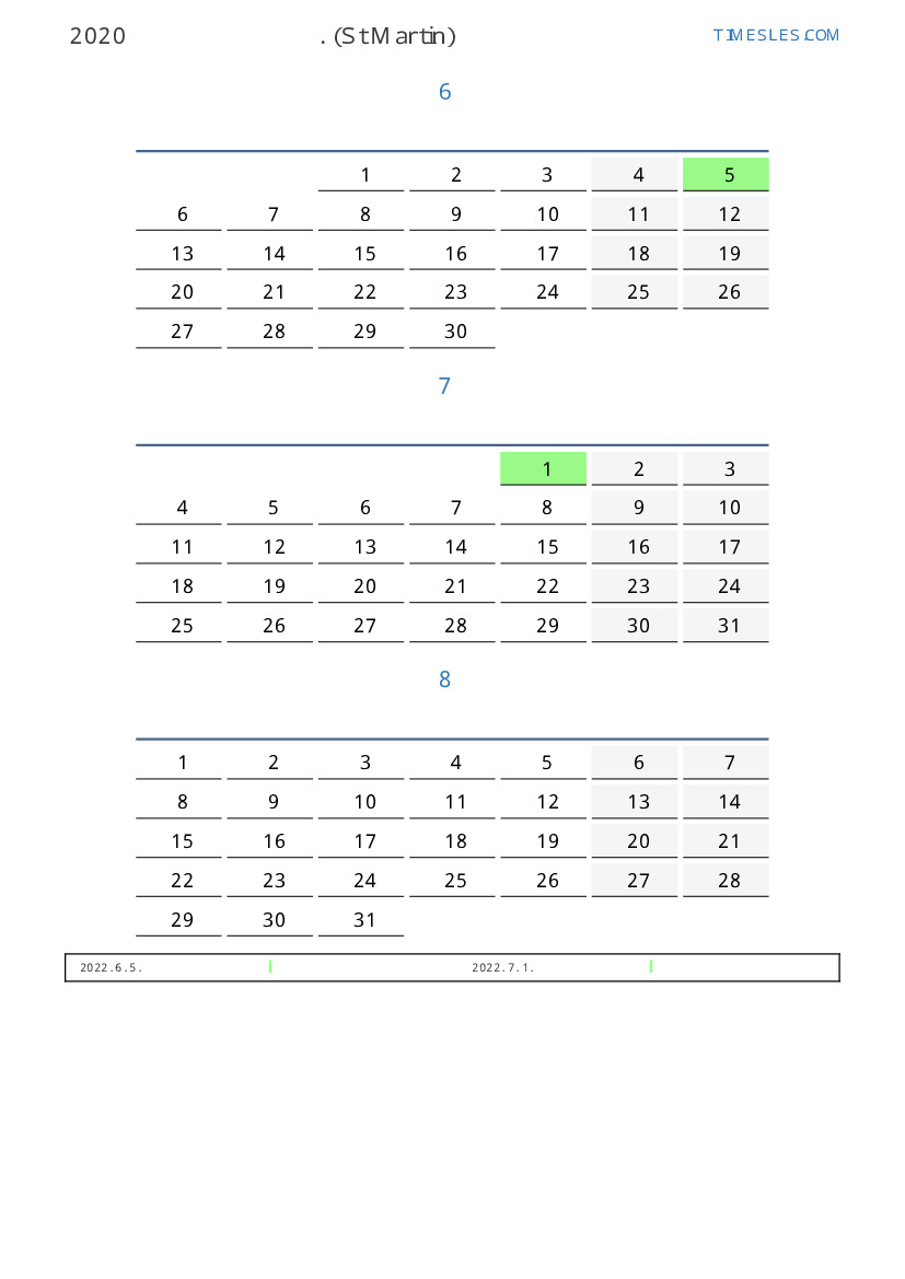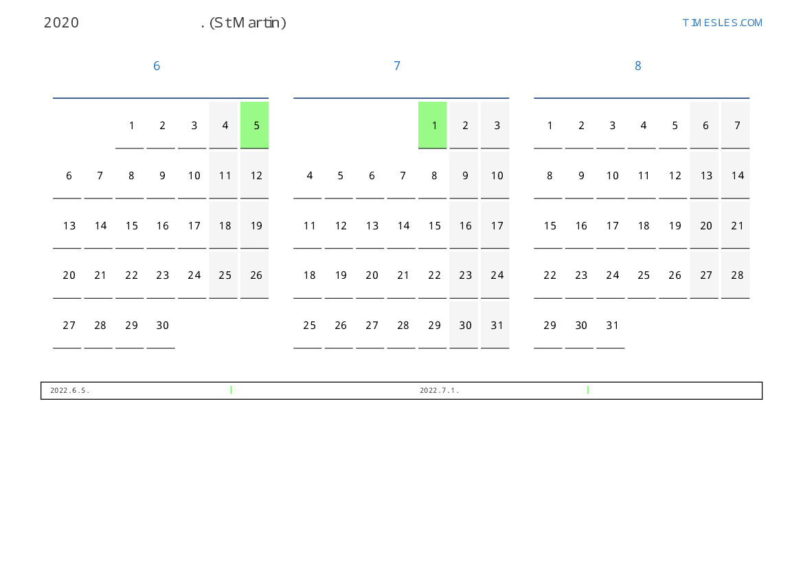 신트 마르 턴 2022 년 여름 동안 공휴일 및 주말이 포함 된 PDF 캘린더 다운로드 및 인쇄