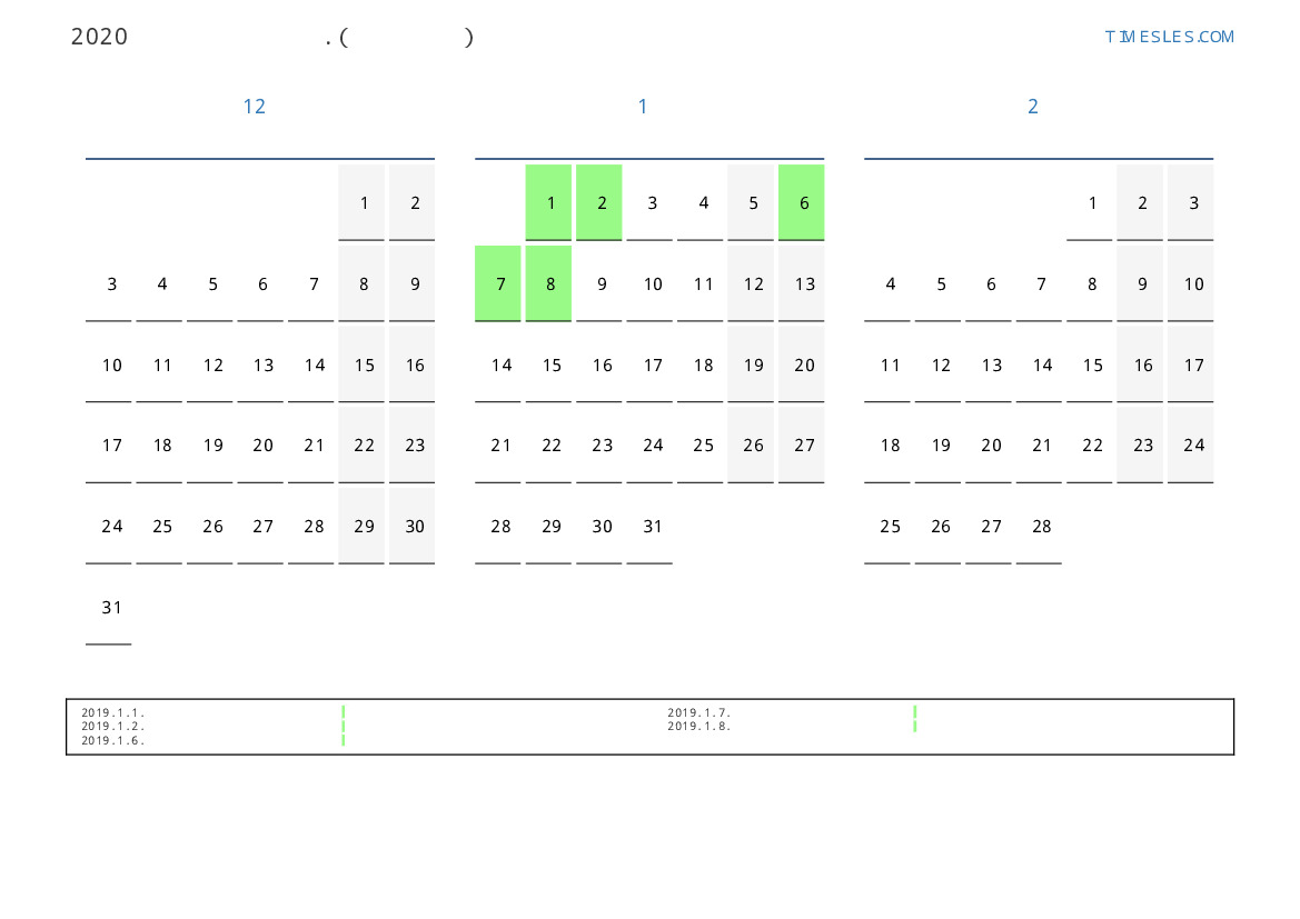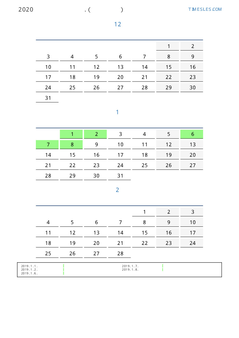 몬테네그로 2019 년 겨울 동안 공휴일 및 주말이 포함 된 PDF 캘린더 다운로드 및 인쇄