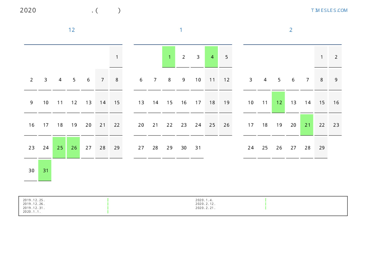 미얀마 2020 년 겨울 동안 공휴일 및 주말이 포함 된 PDF 캘린더 다운로드 및 인쇄