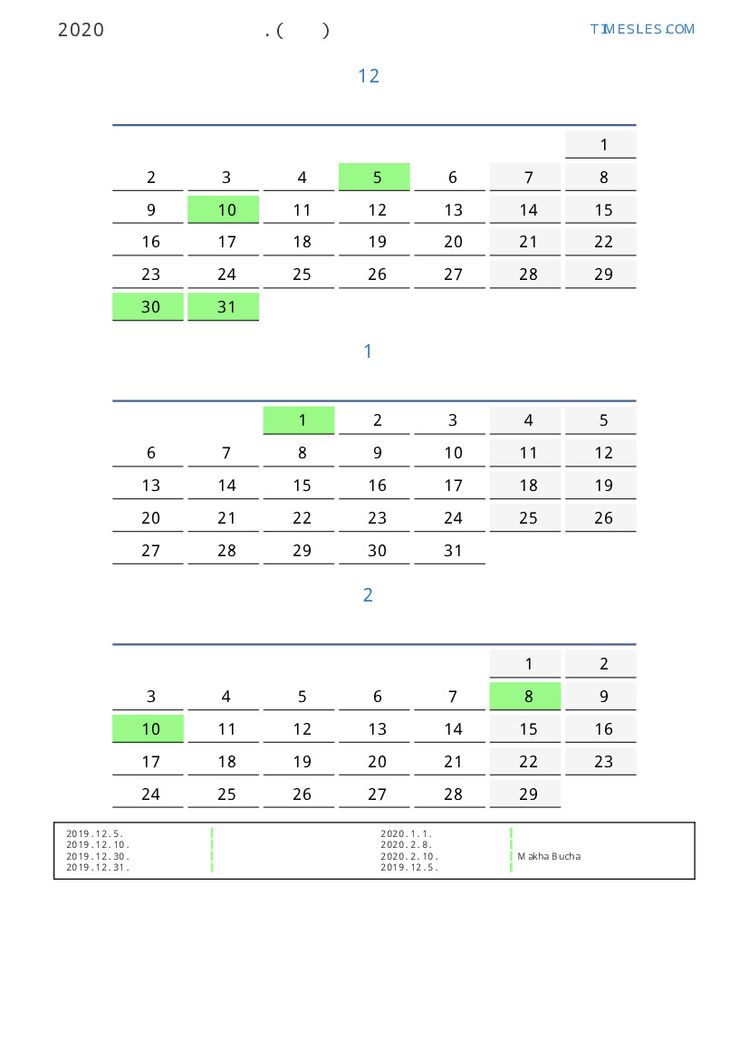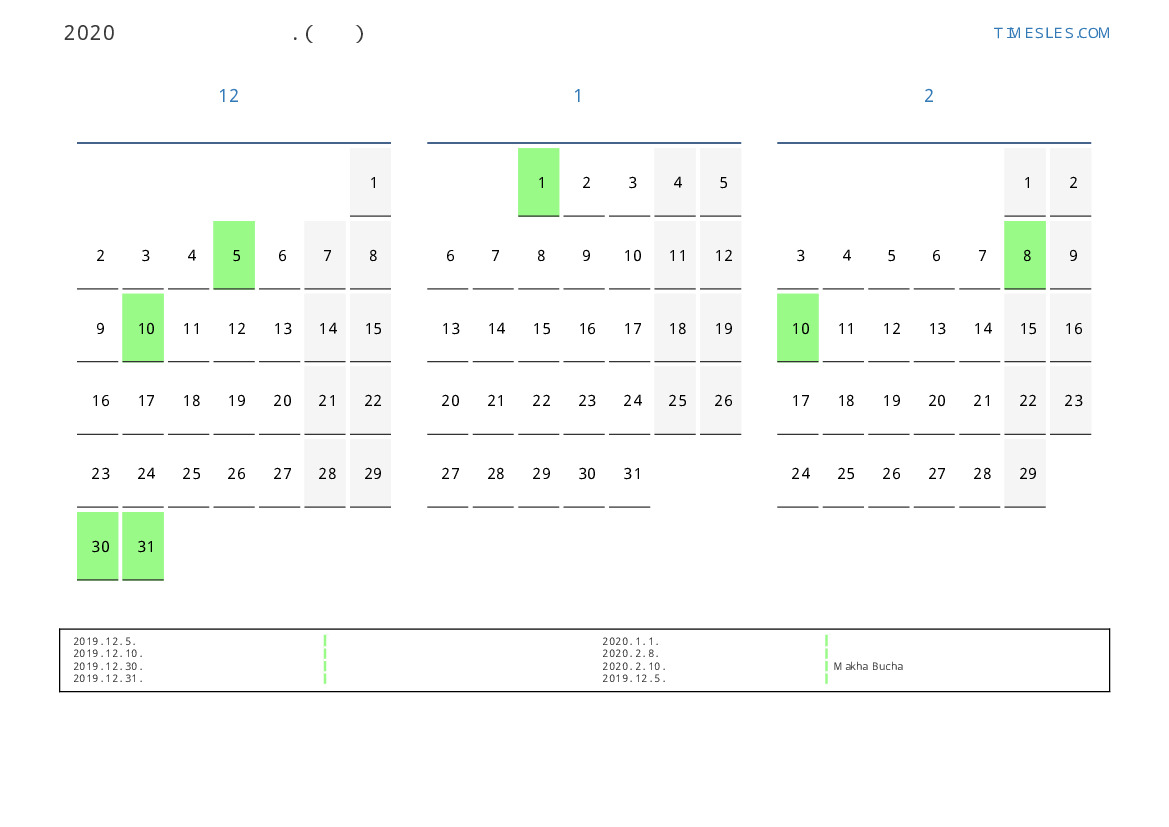 태국 2020 년 겨울 동안 공휴일 및 주말이 포함 된 PDF 캘린더 다운로드 및 인쇄