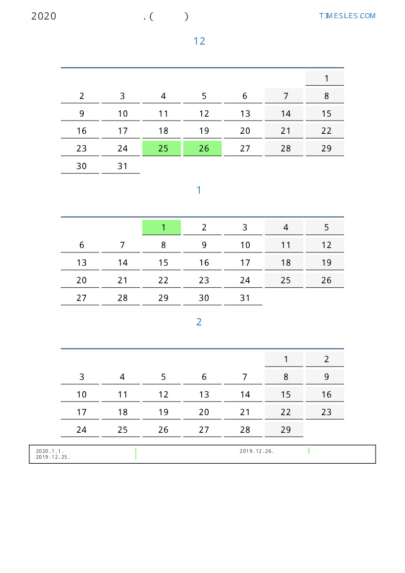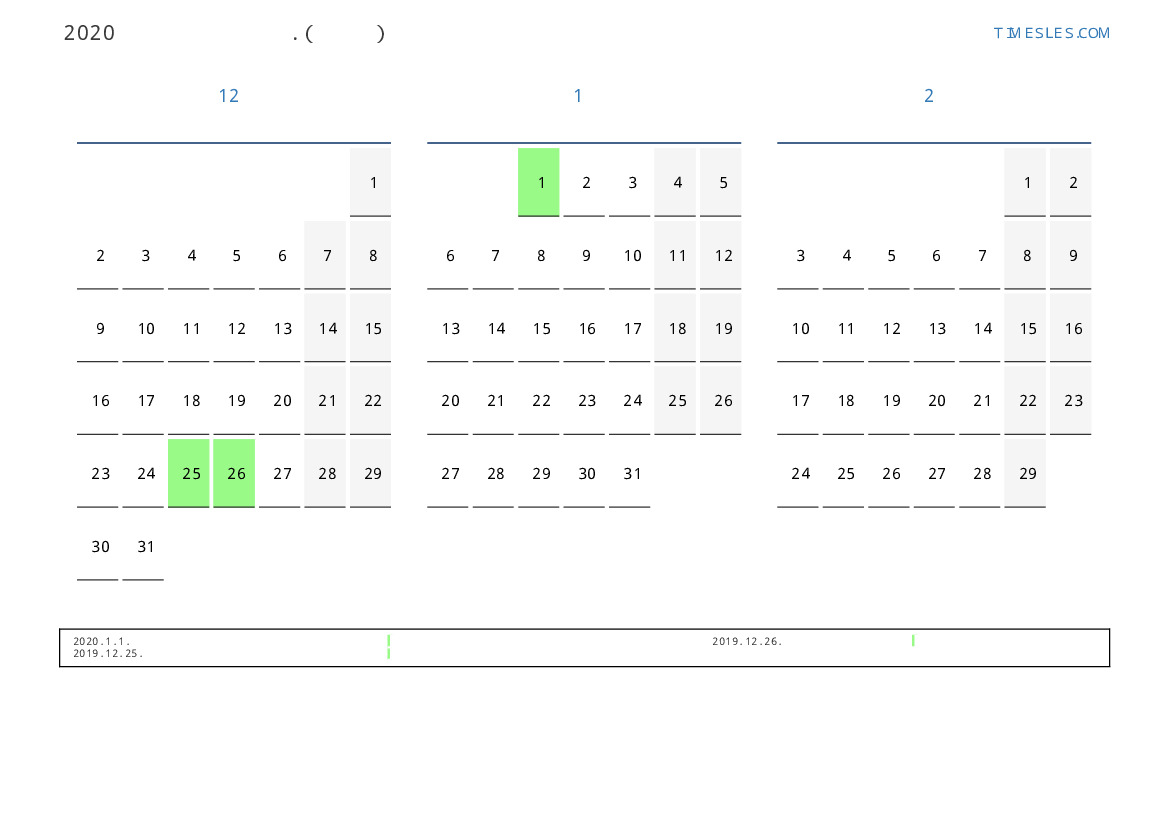 투발루 2020 년 겨울 동안 공휴일 및 주말이 포함 된 PDF 캘린더 다운로드 및 인쇄