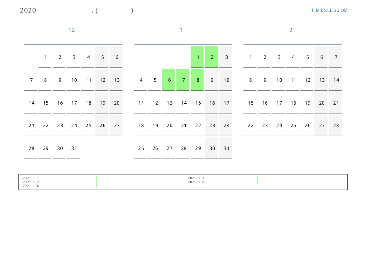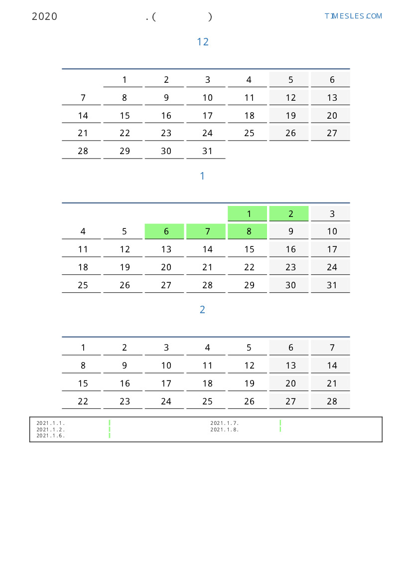몬테네그로 2021 년 겨울 동안 공휴일 및 주말이 포함 된 PDF 캘린더 다운로드 및 인쇄