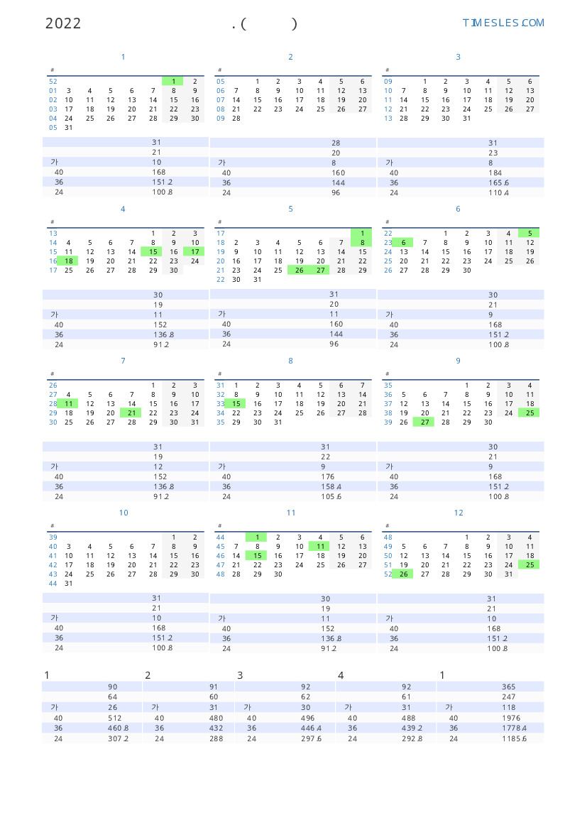 올해의 세로 근무일 달력