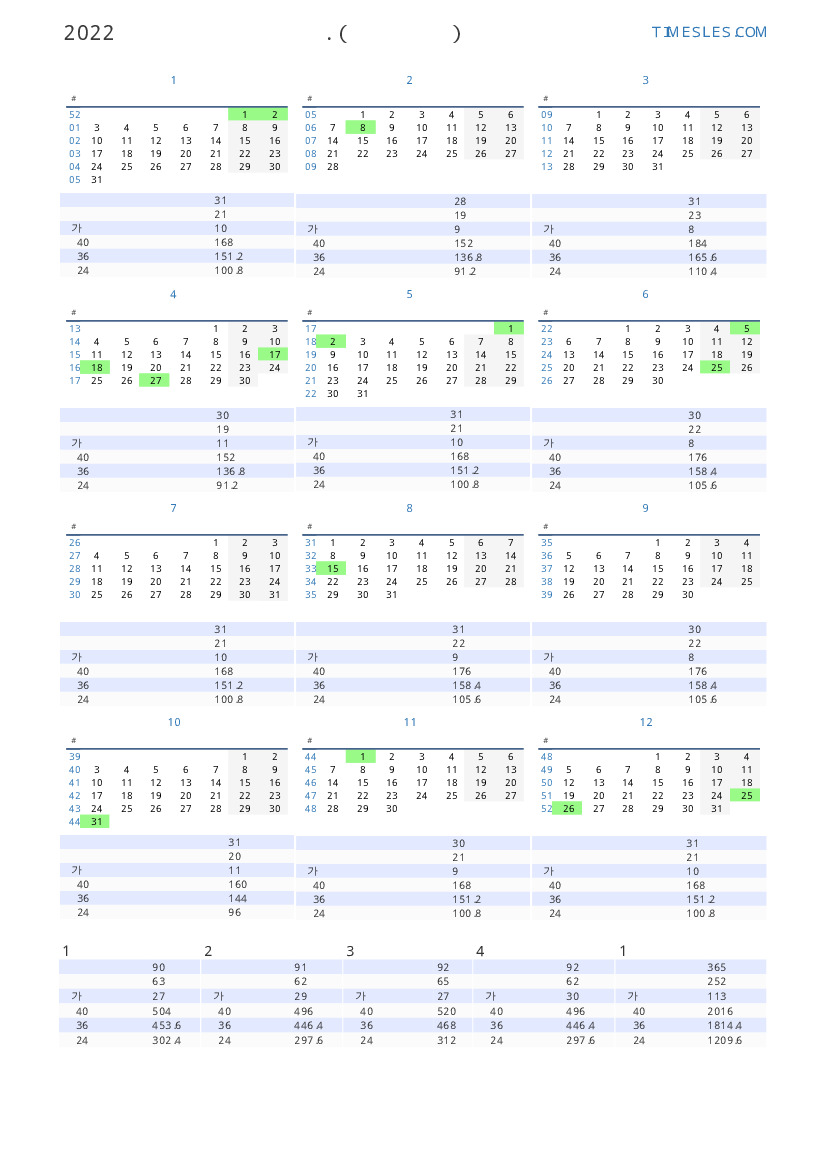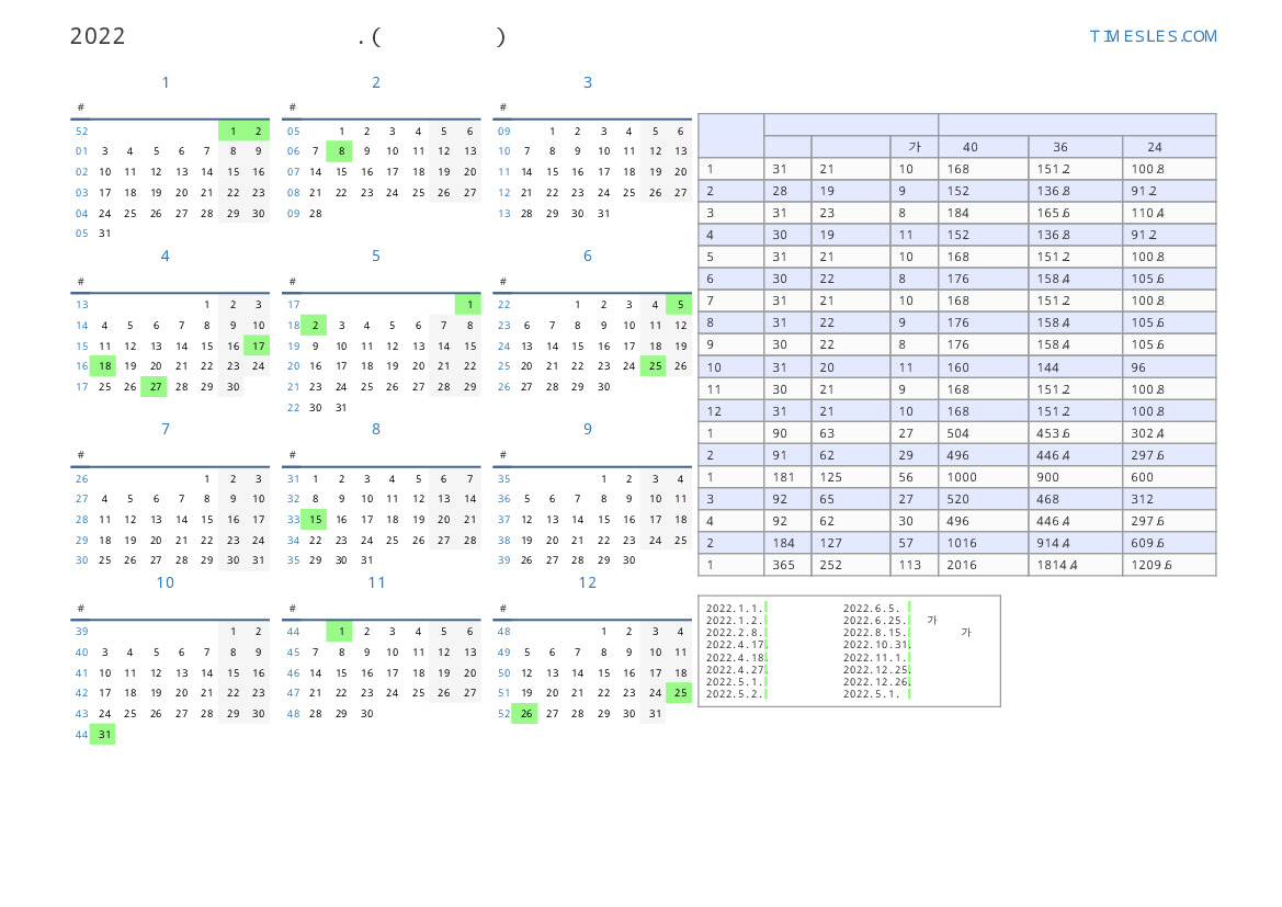 올해의 세로 근무일 달력