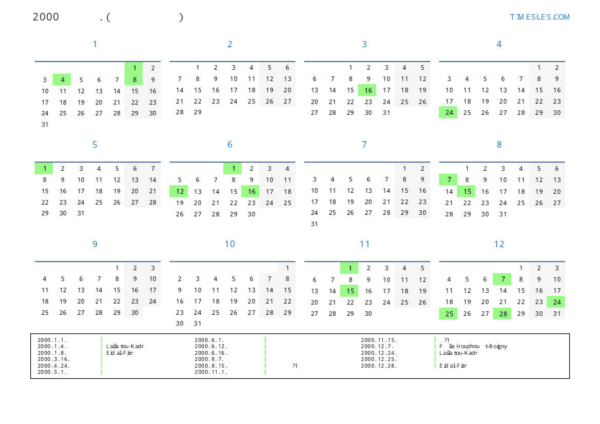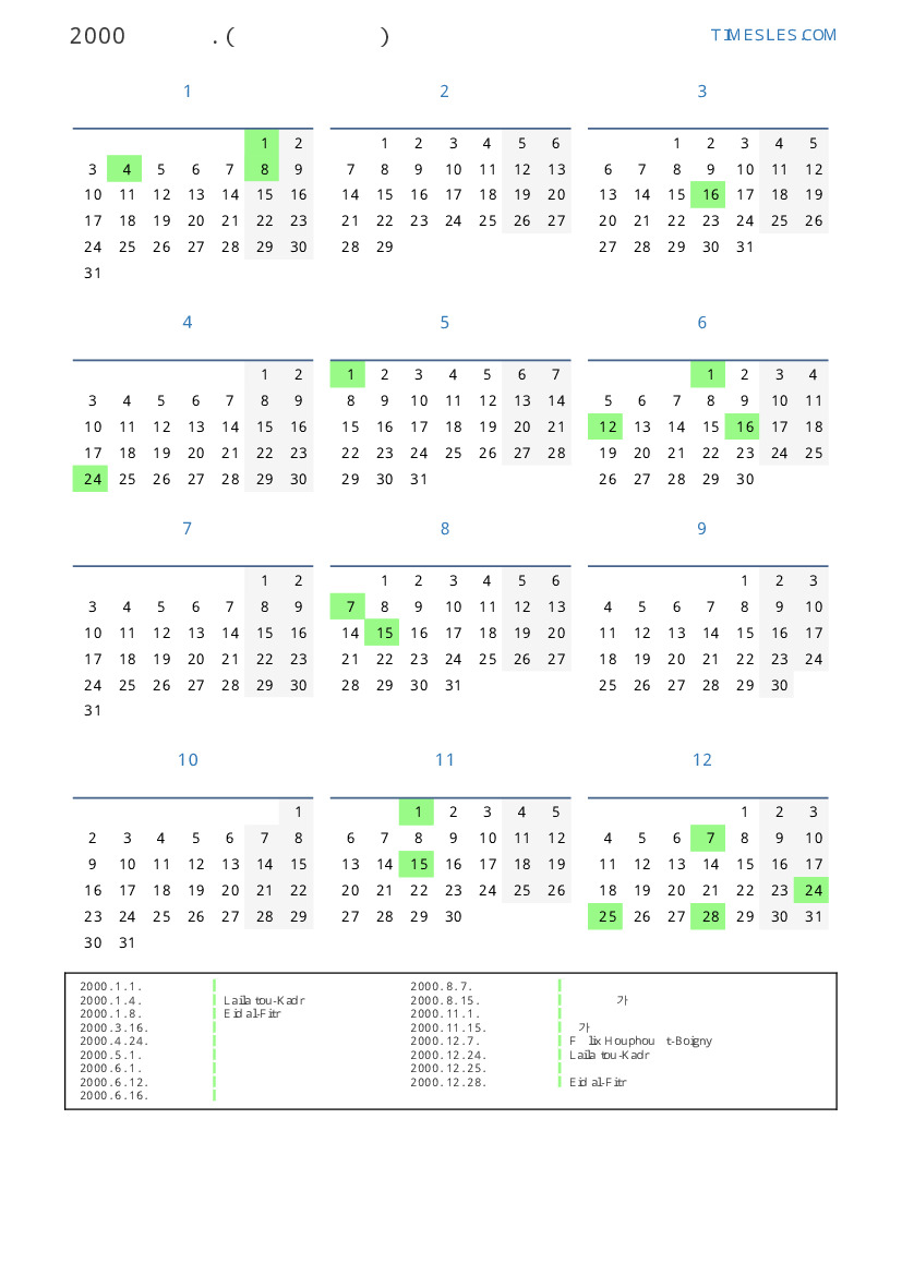 코트 디부 아르 2000 년 공휴일 및 주말이 포함 된 PDF 캘린더 다운로드 및 인쇄