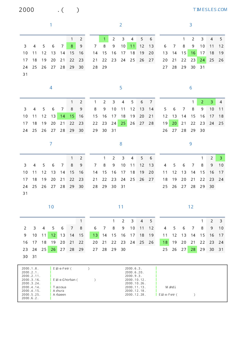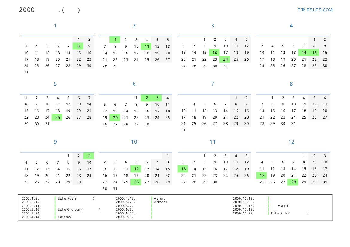 이란 의 2000 년 공휴일 및 주말 달력