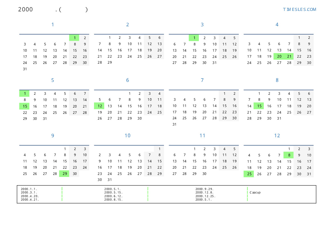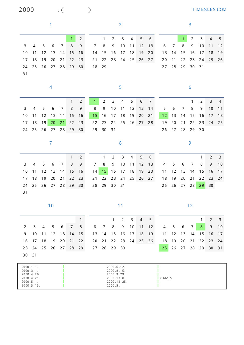 그레고리 안, 윤년, 1 년에 366 일. 2000년 파라과이 18 공휴일 및 휴무 있습니다. 중국 동부 달력에서 2000 년은 용의 해입니다. 연도는 토요일에 시작하여 일요일에 끝납니다.