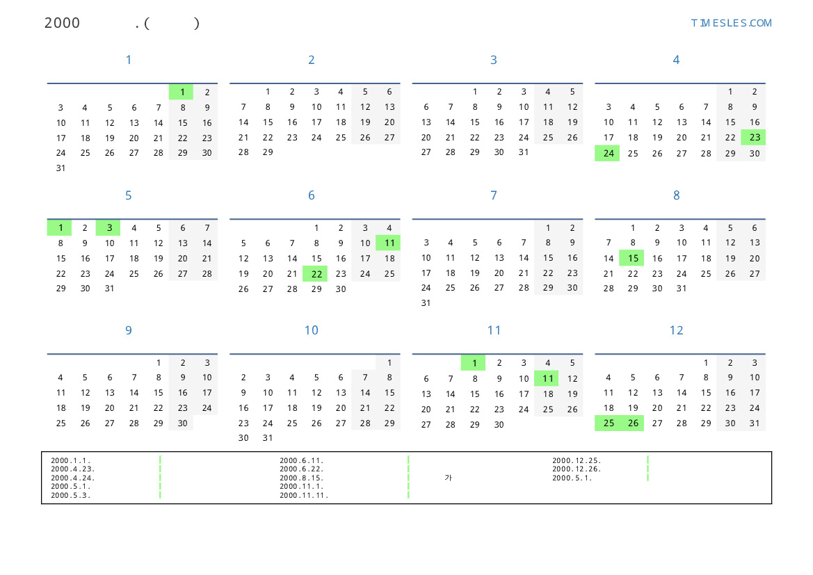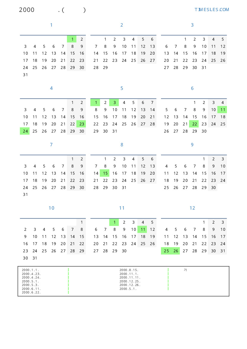 그레고리 안, 윤년, 1 년에 366 일. 2000년 폴란드에서는 25 공휴일 및 휴무 있습니다. 중국 동부 달력에서 2000 년은 용의 해입니다. 연도는 토요일에 시작하여 일요일에 끝납니다.