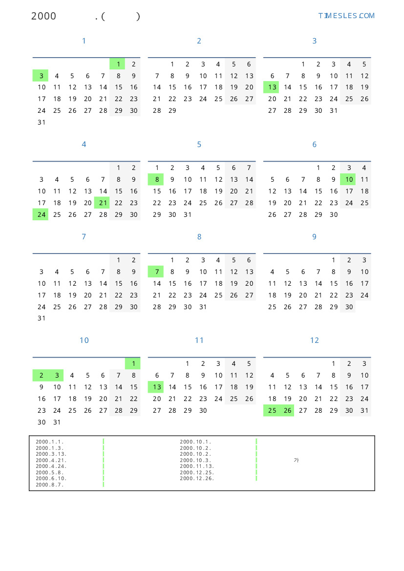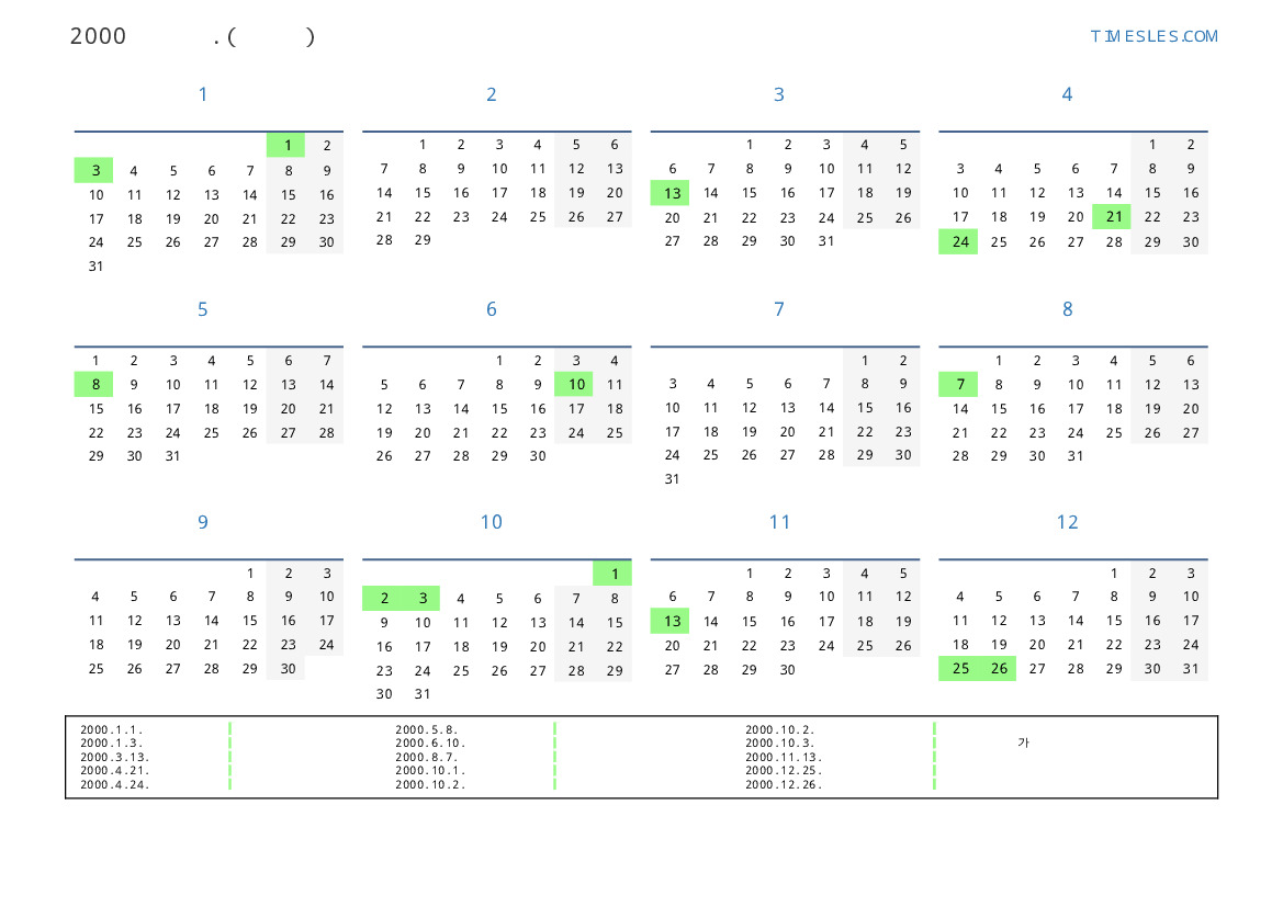 투발루 2000 년 공휴일 및 주말이 포함 된 PDF 캘린더 다운로드 및 인쇄