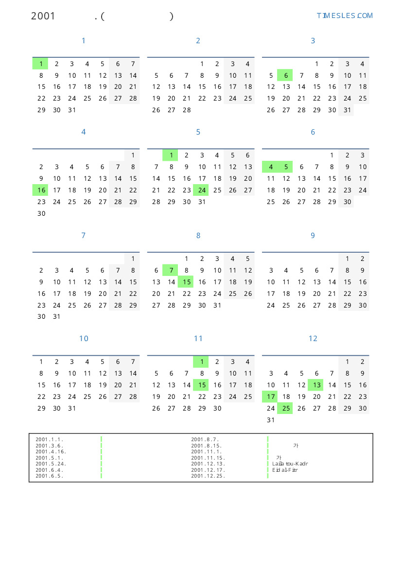 코트 디부 아르 2001 년 공휴일 및 주말이 포함 된 PDF 캘린더 다운로드 및 인쇄