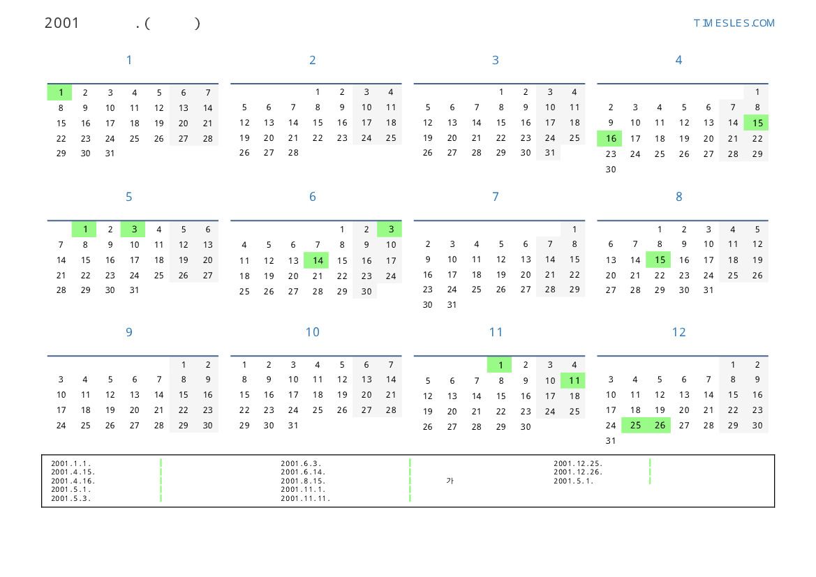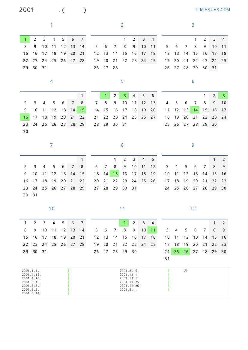 그레고리 안, 윤년이 아니다, 1 년에 365 일. 2001년 폴란드에서는 25 공휴일 및 휴무 있습니다. 중국 동부 달력에서 2001 년은 뱀의 해입니다. 연도는 월요일에 시작하여 월요일에 끝납니다.