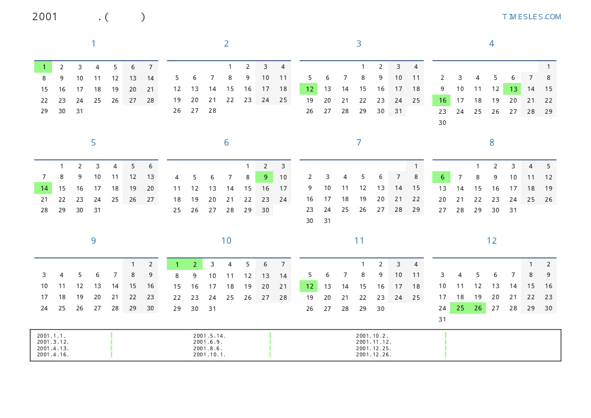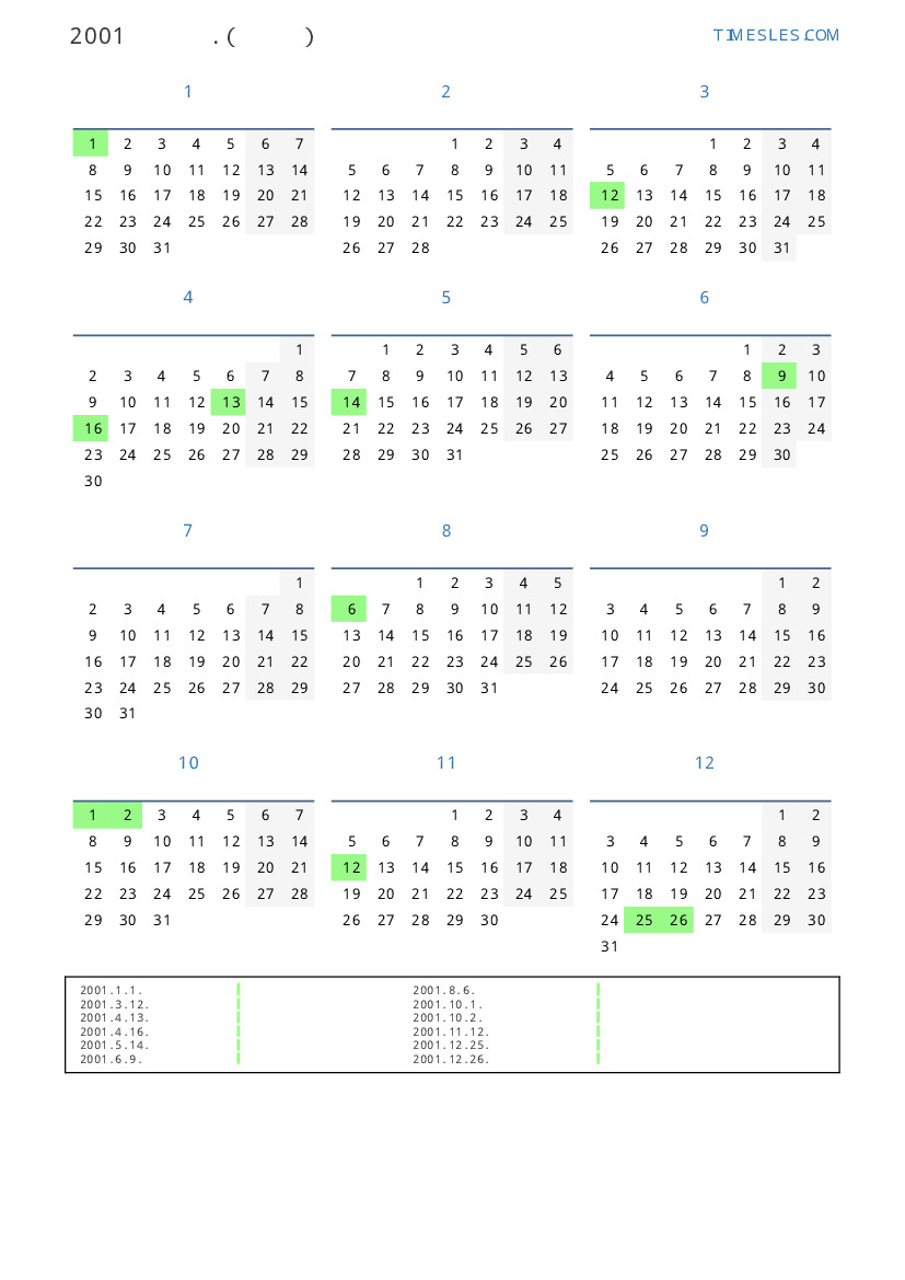 그레고리 안, 윤년이 아니다, 1 년에 365 일. 2001년 투발루 17 공휴일 및 휴무 있습니다. 중국 동부 달력에서 2001 년은 뱀의 해입니다. 연도는 월요일에 시작하여 월요일에 끝납니다.