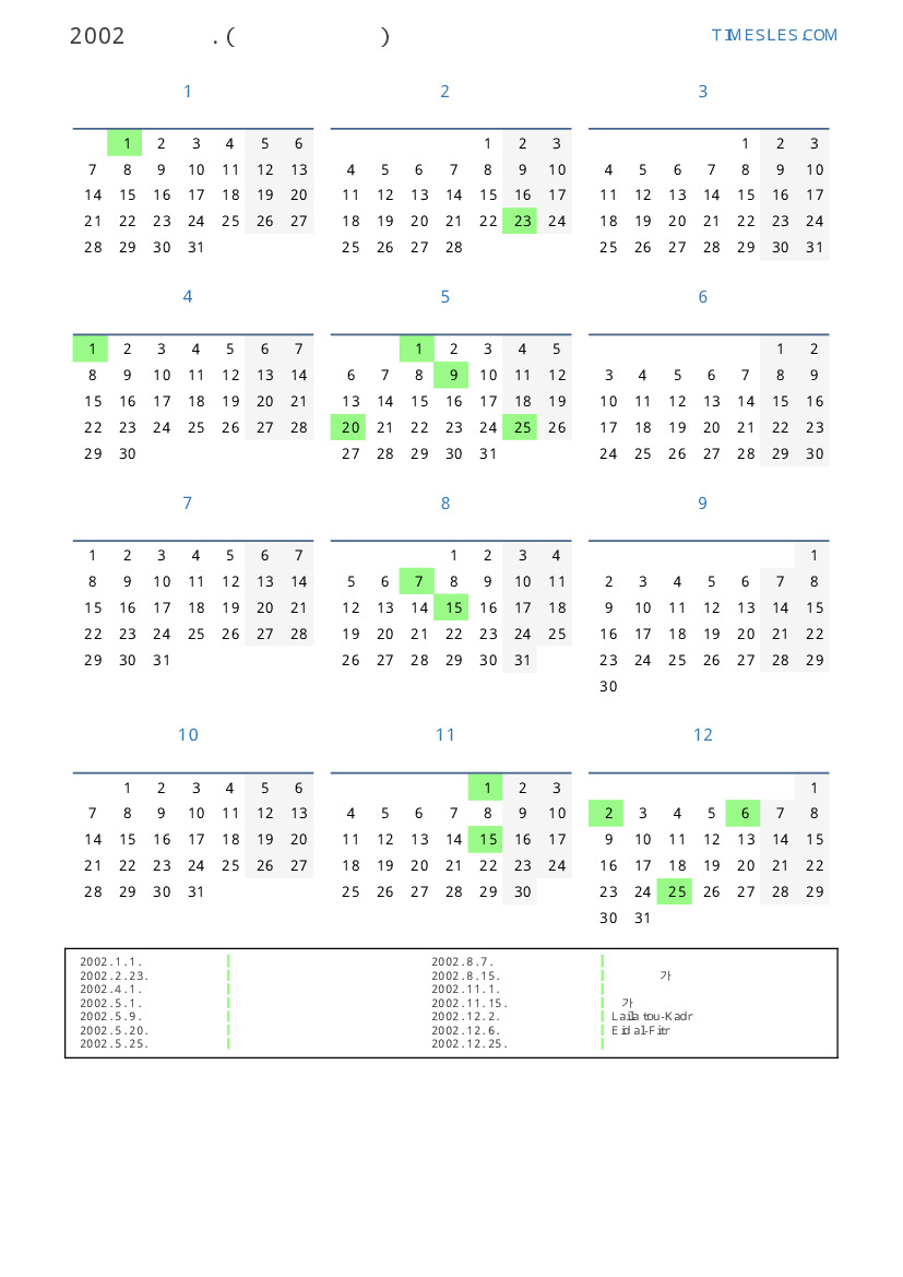 코트 디부 아르 2002 년 공휴일 및 주말이 포함 된 PDF 캘린더 다운로드 및 인쇄