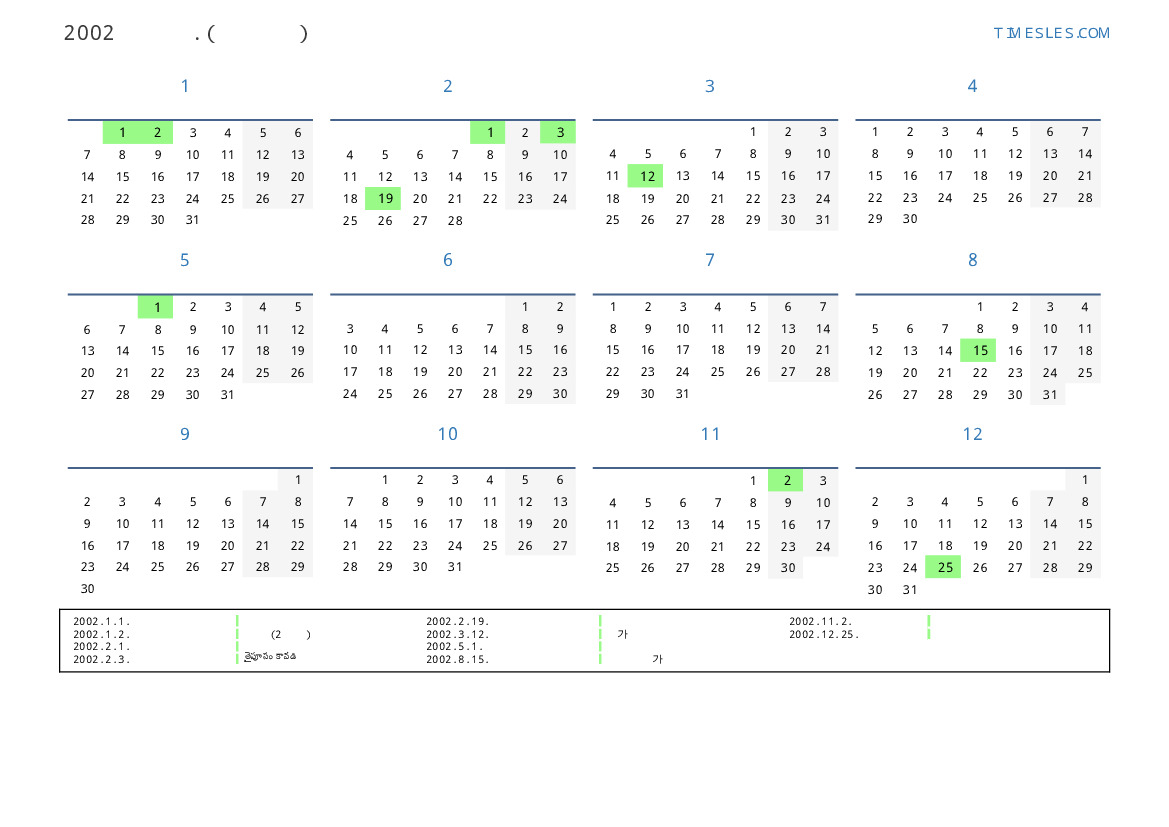 모리셔스 의 2002 년 공휴일 및 주말 달력