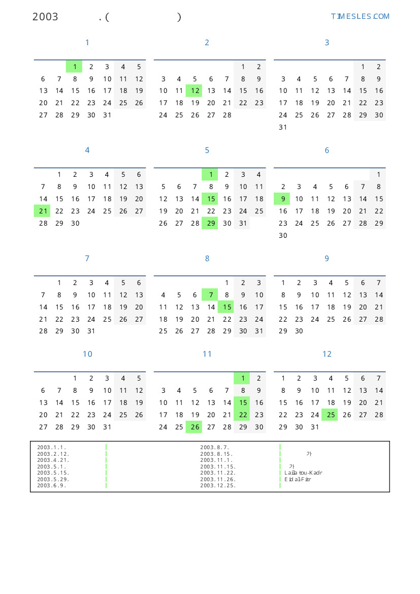 코트 디부 아르 2003 년 공휴일 및 주말이 포함 된 PDF 캘린더 다운로드 및 인쇄