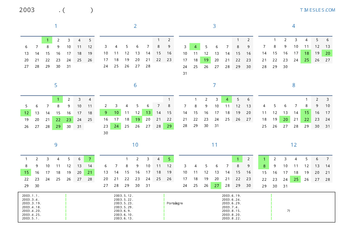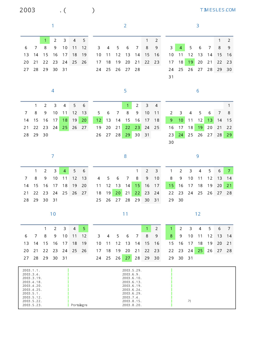 포르투갈 의 2003 년 공휴일 및 주말 달력