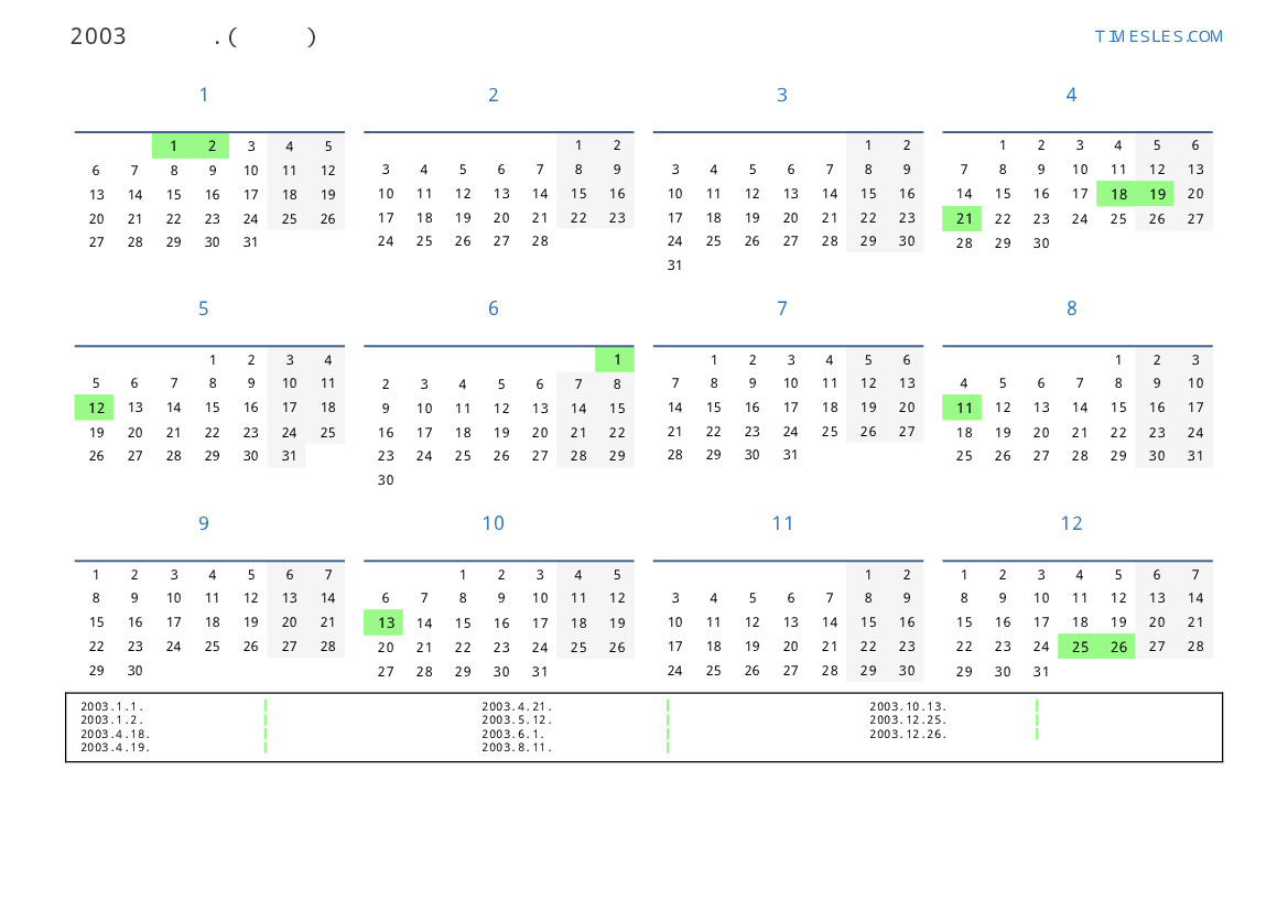 그레고리 안, 윤년이 아니다, 1 년에 365 일. 2003년 사모아 15 공휴일 및 휴무 있습니다. 중국 동부 달력에서 2003 년은 양의 해입니다. 연도는 수요일에 시작하여 수요일에 끝납니다.