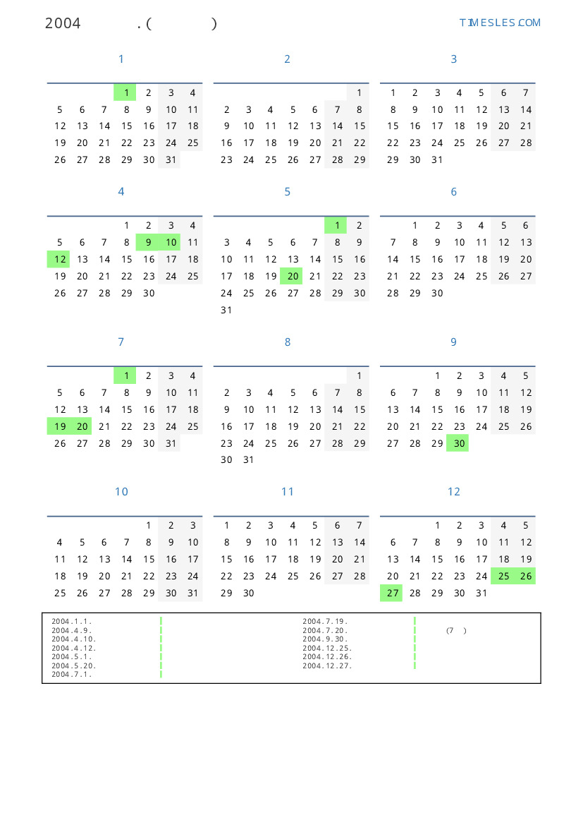 그레고리 안, 윤년, 1 년에 366 일. 2004년 보츠와나 19 공휴일 및 휴무 있습니다. 중국 동부 달력에서 2004 년은 원숭이의 해입니다. 연도는 목요일에 시작하여 금요일에 끝납니다.
