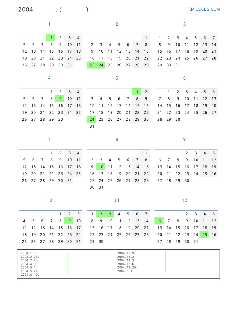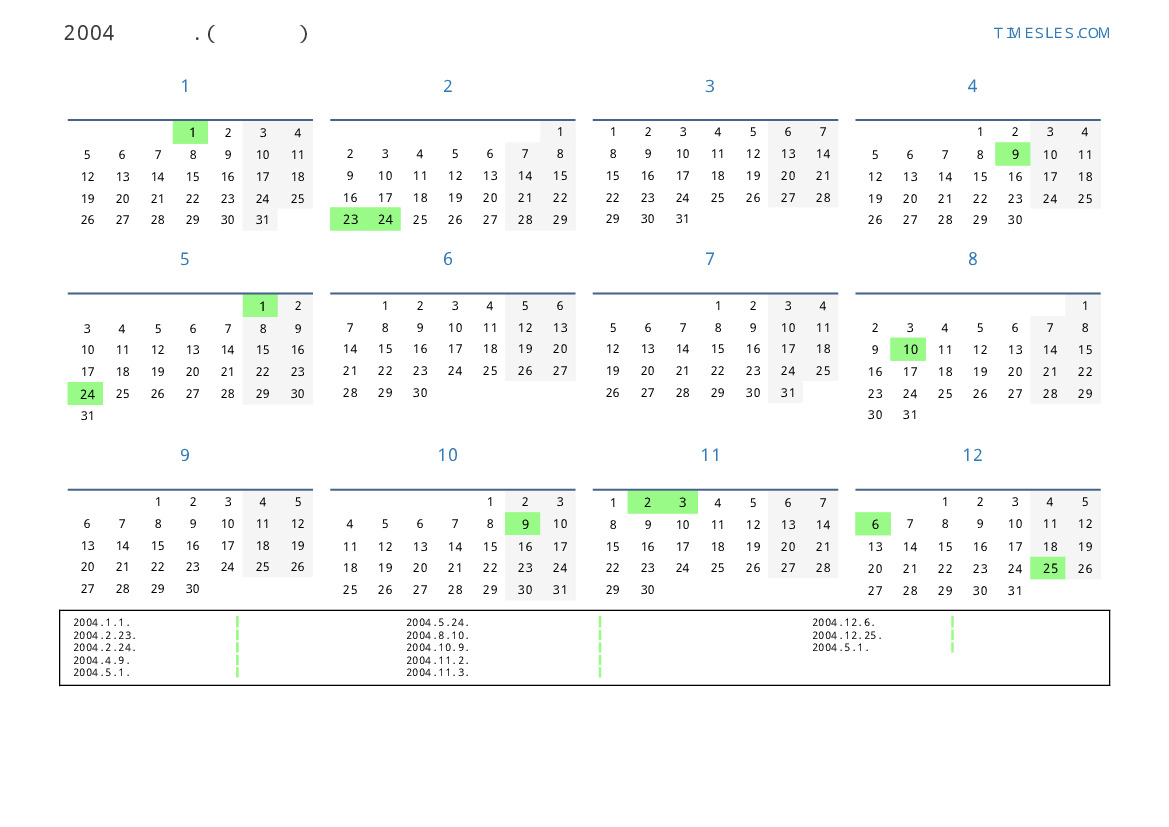 그레고리 안, 윤년, 1 년에 366 일. 2004년 에콰도르 24 공휴일 및 휴무 있습니다. 중국 동부 달력에서 2004 년은 원숭이의 해입니다. 연도는 목요일에 시작하여 금요일에 끝납니다.