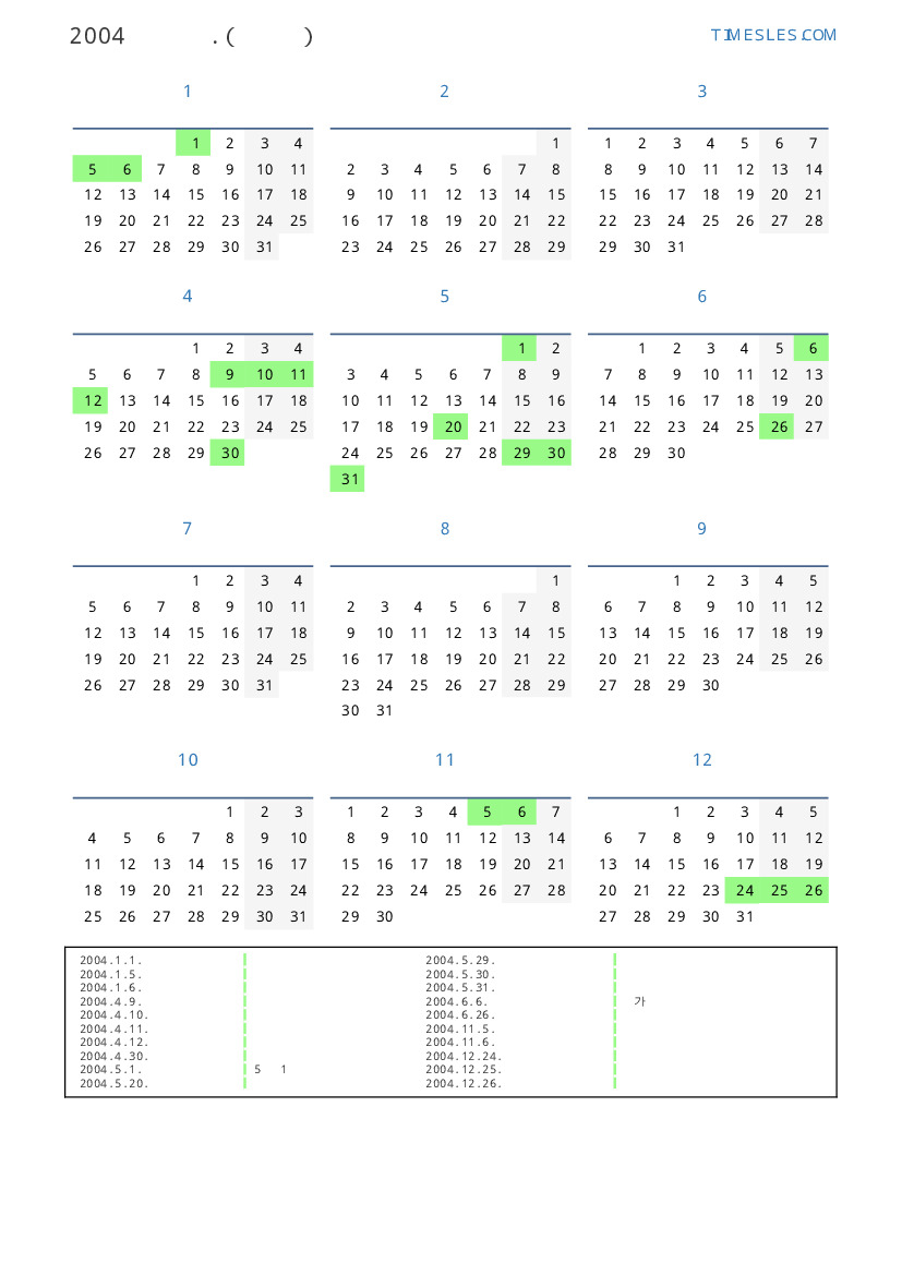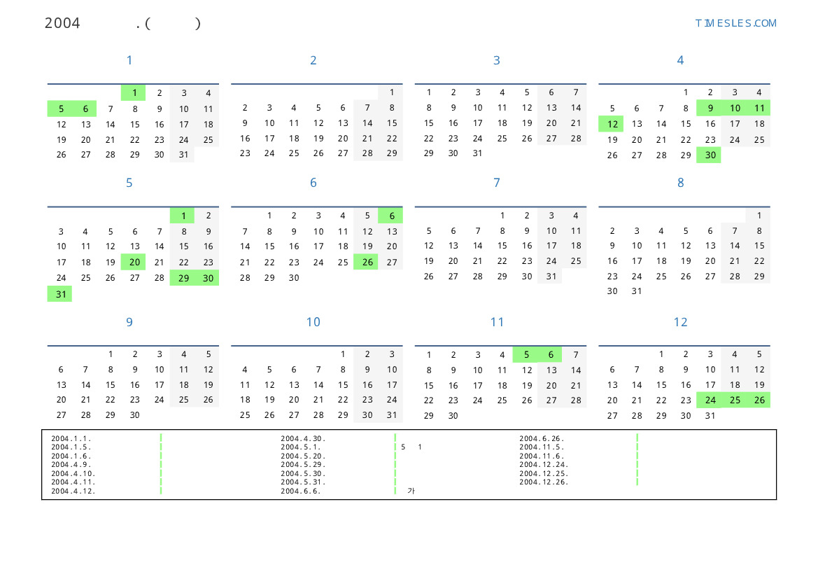 그레고리 안, 윤년, 1 년에 366 일. 2004년 스웨덴 35 공휴일 및 휴무 있습니다. 중국 동부 달력에서 2004 년은 원숭이의 해입니다. 연도는 목요일에 시작하여 금요일에 끝납니다.