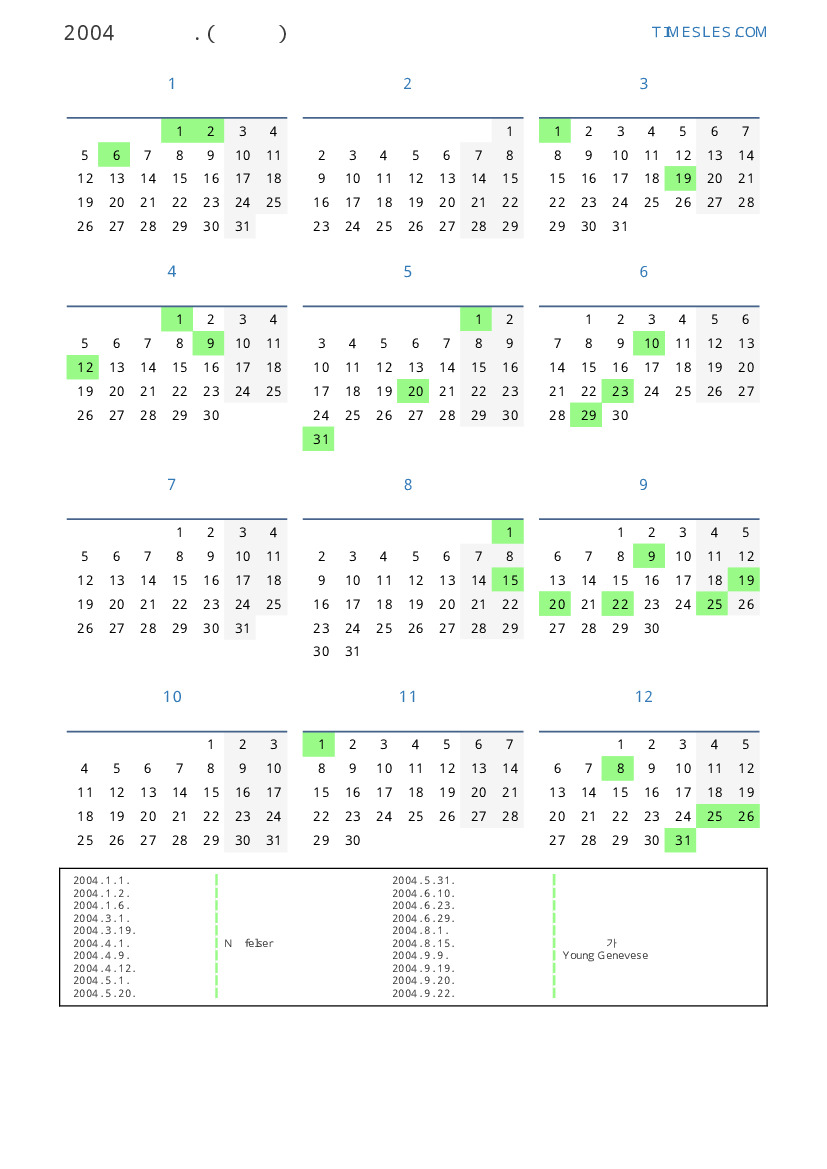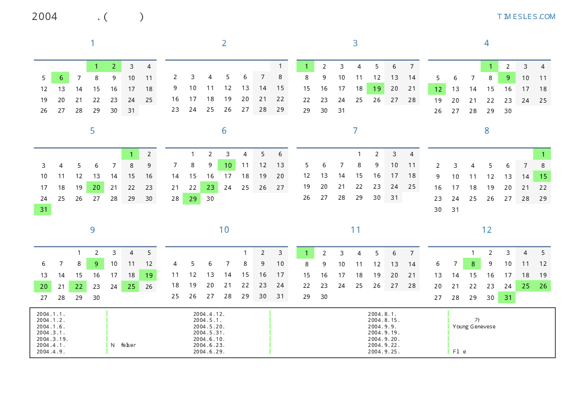 그레고리 안, 윤년, 1 년에 366 일. 2004년 스위스에서 40 공휴일 및 휴무 있습니다. 중국 동부 달력에서 2004 년은 원숭이의 해입니다. 연도는 목요일에 시작하여 금요일에 끝납니다.