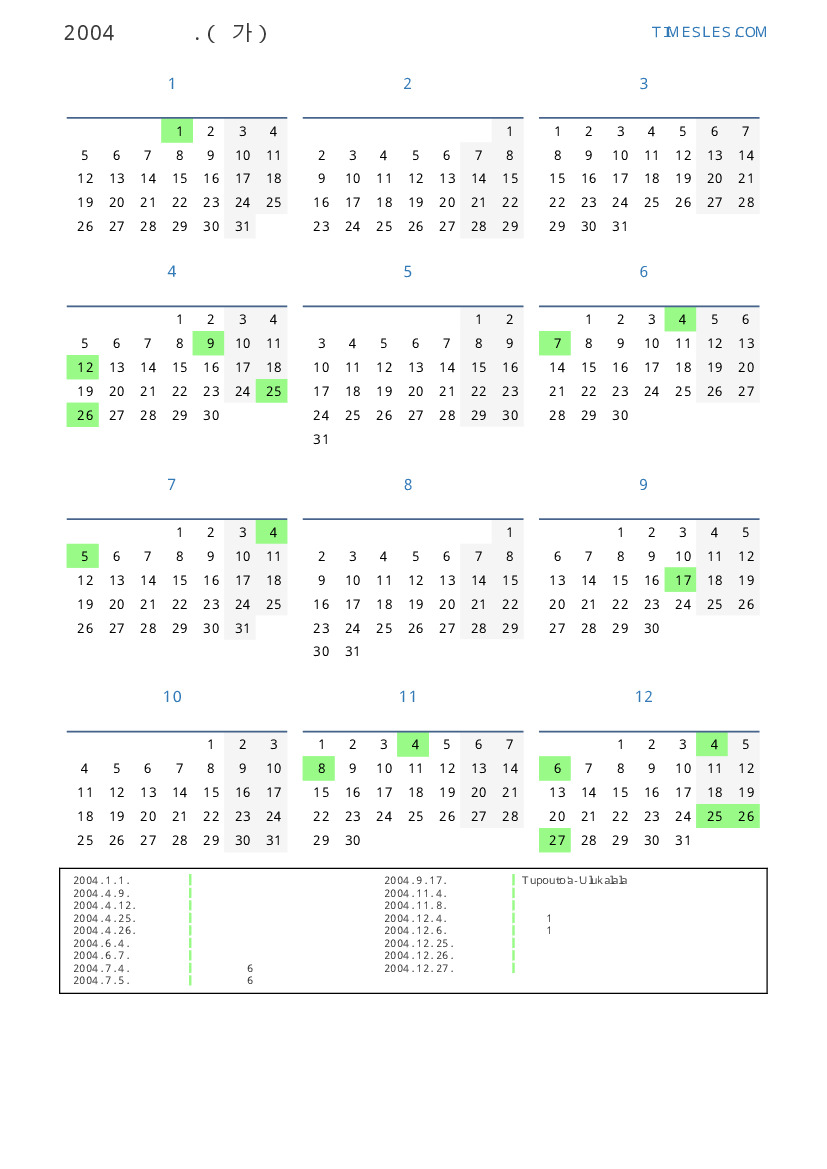 그레고리 안, 윤년, 1 년에 366 일. 2004년 통가 21 공휴일 및 휴무 있습니다. 중국 동부 달력에서 2004 년은 원숭이의 해입니다. 연도는 목요일에 시작하여 금요일에 끝납니다.