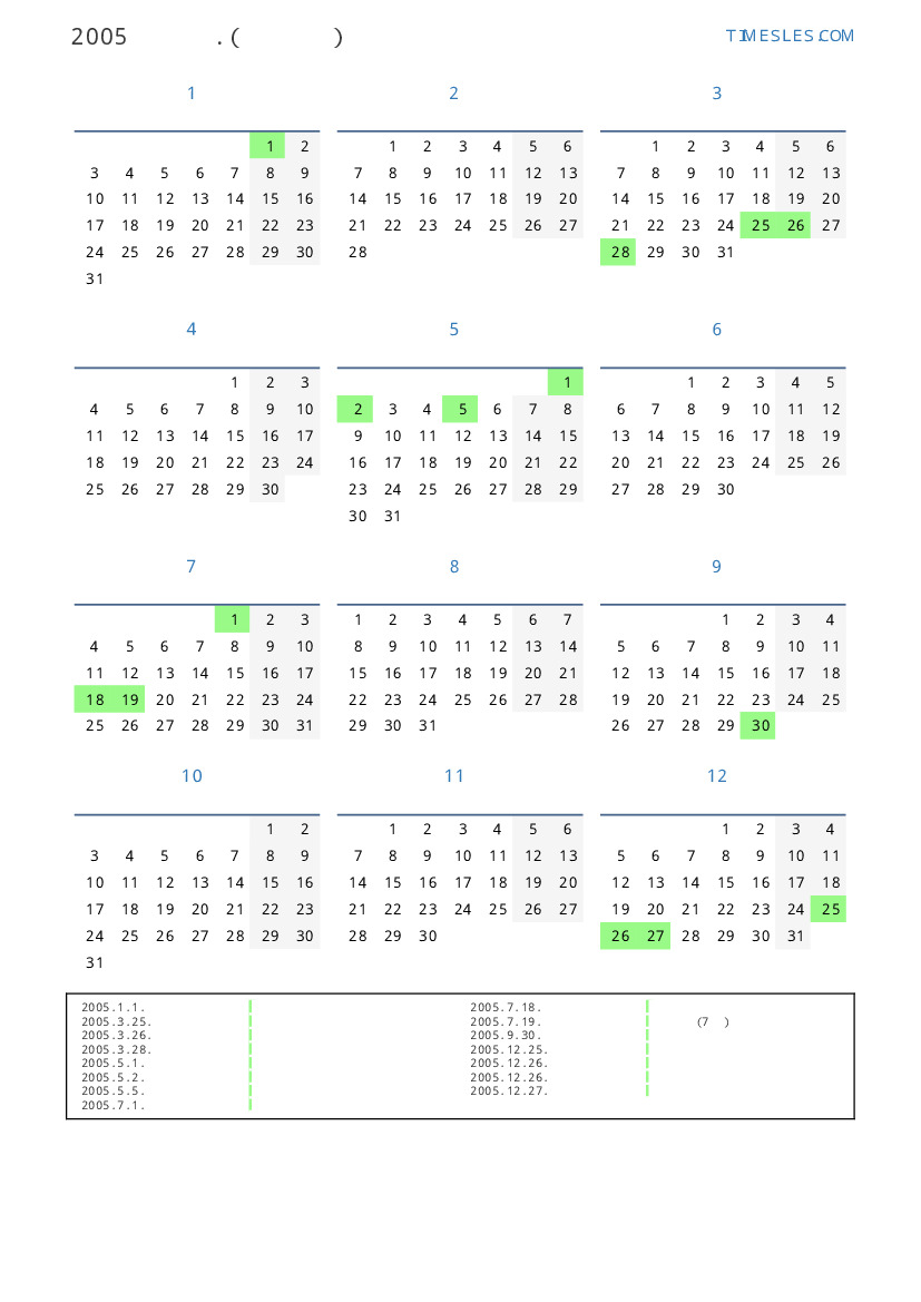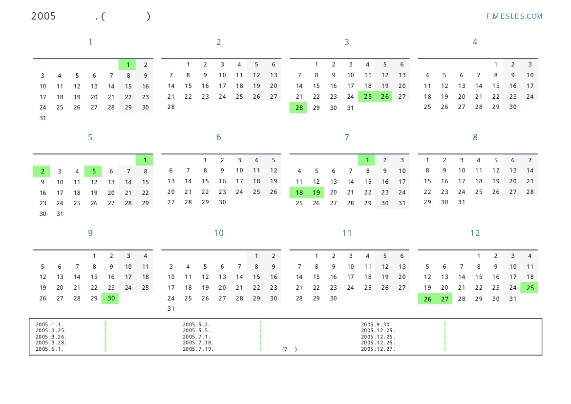 보츠와나 2005 년 공휴일 및 주말이 포함 된 PDF 캘린더 다운로드 및 인쇄
