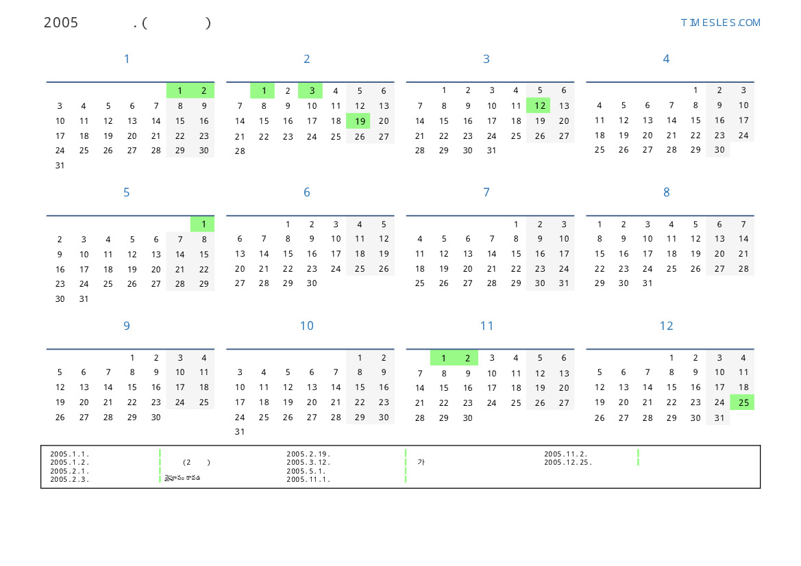 모리셔스 의 2005 년 공휴일 및 주말 달력