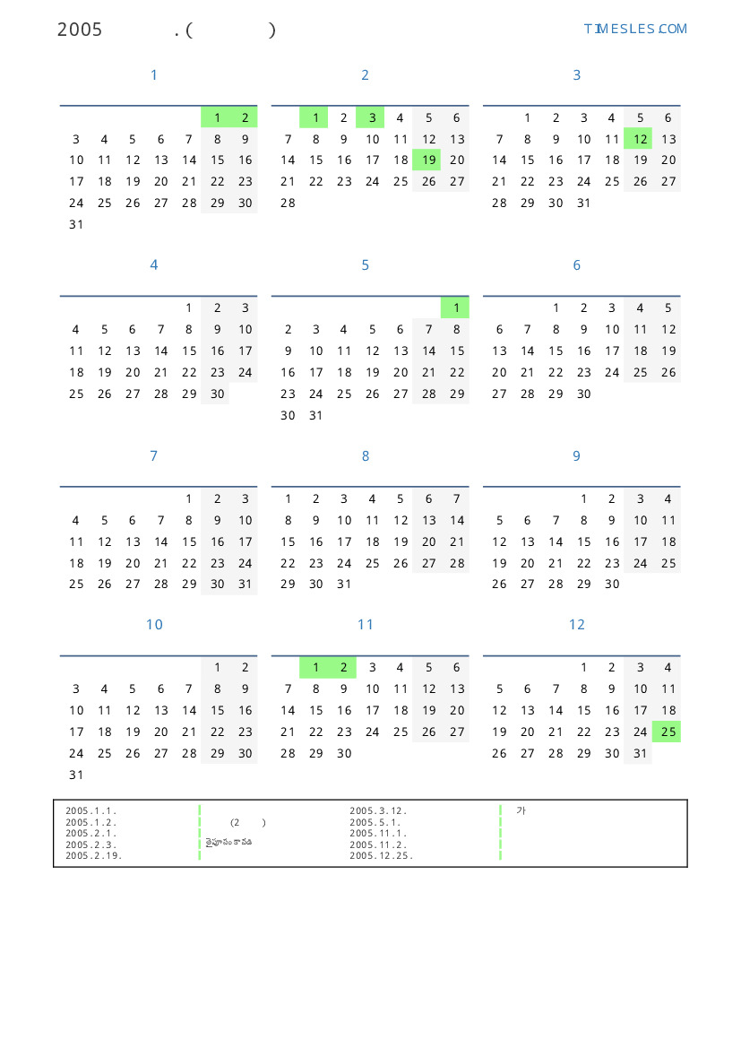 모리셔스 2005 년 공휴일 및 주말이 포함 된 PDF 캘린더 다운로드 및 인쇄