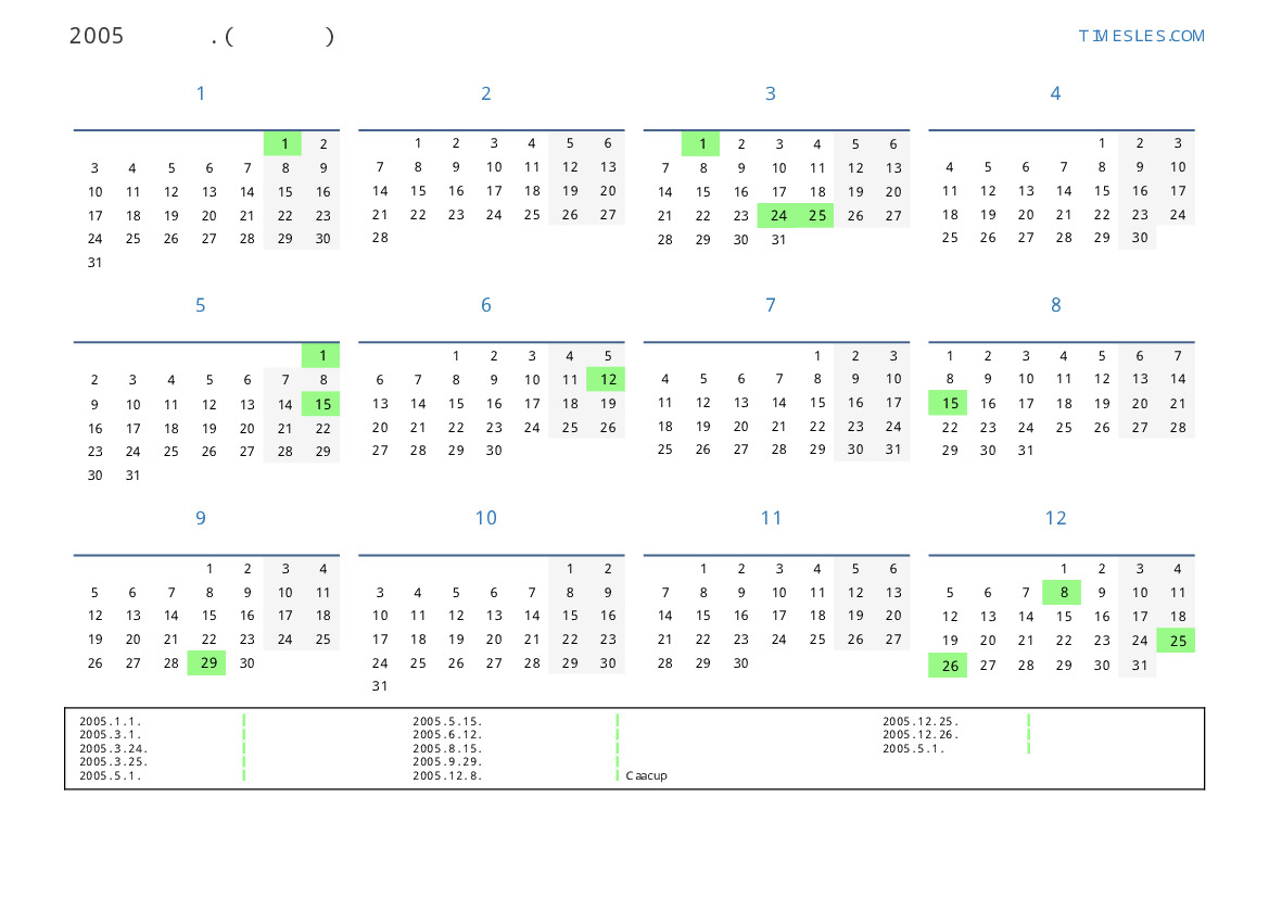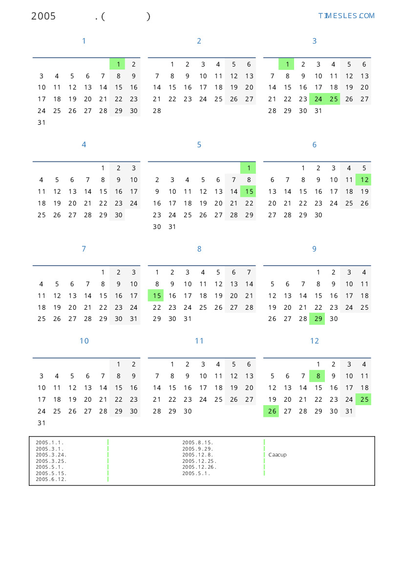 그레고리 안, 윤년이 아니다, 1 년에 365 일. 2005년 파라과이 19 공휴일 및 휴무 있습니다. 중국 동부 달력에서 2005 년은 수탉의 해입니다. 연도는 토요일에 시작하여 토요일에 끝납니다.