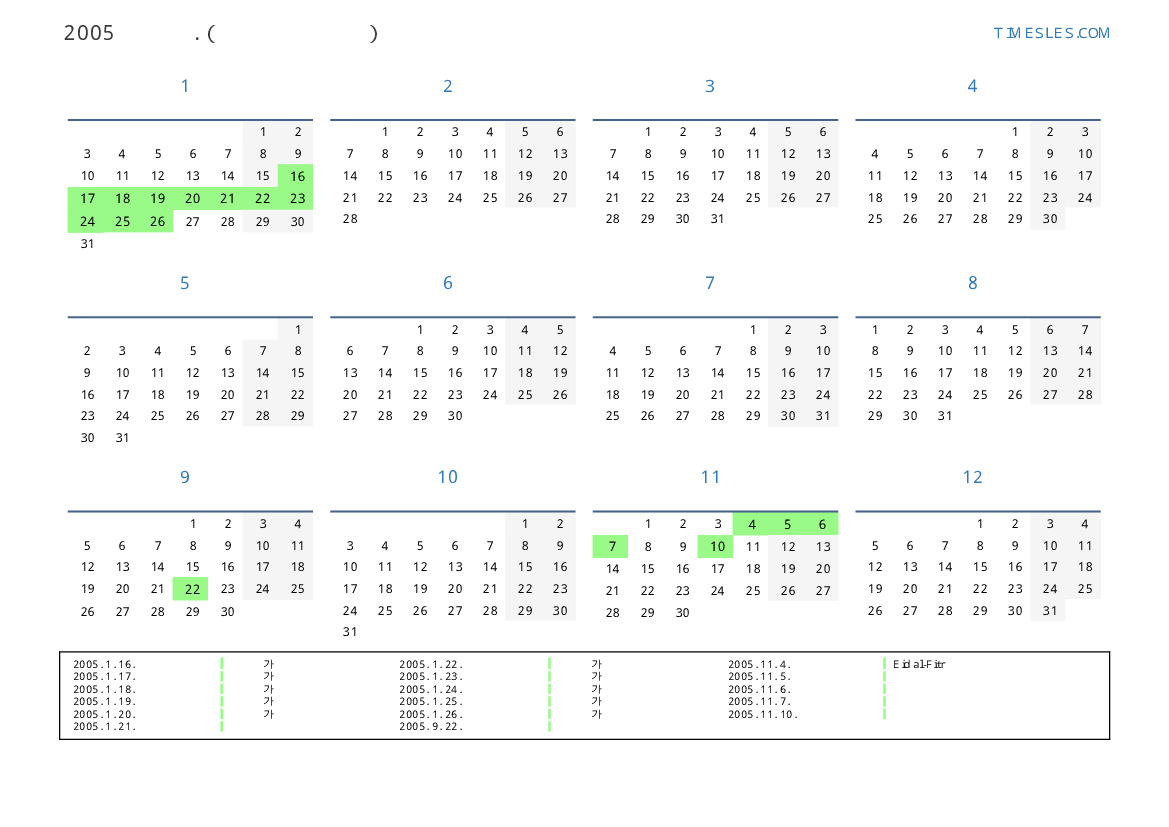 사우디 아라비아 2005 년 공휴일 및 주말이 포함 된 PDF 캘린더 다운로드 및 인쇄
