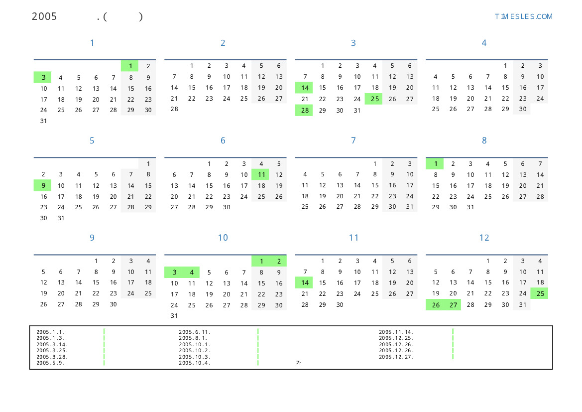 투발루 2005 년 공휴일 및 주말이 포함 된 PDF 캘린더 다운로드 및 인쇄