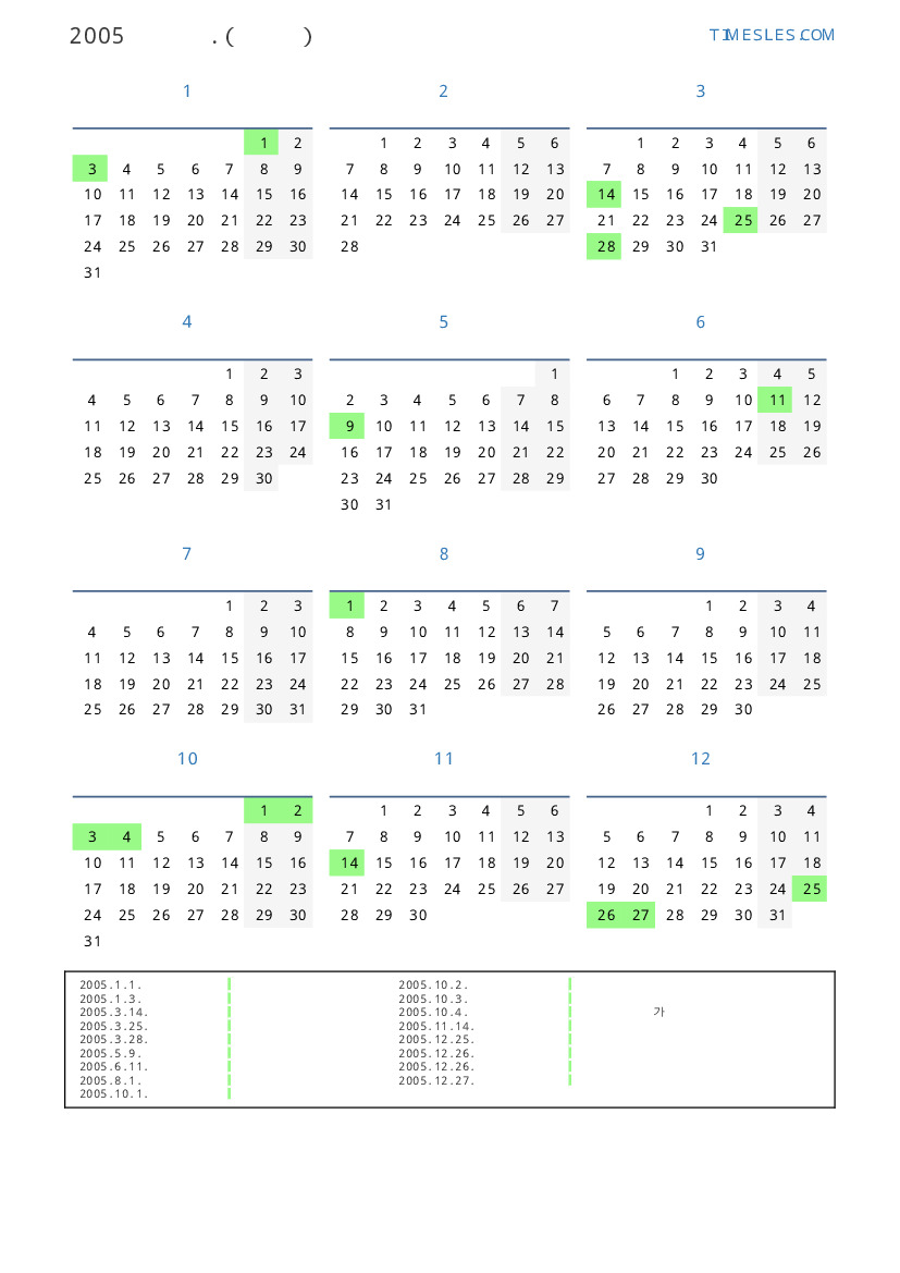 투발루 의 2005 년 공휴일 및 주말 달력