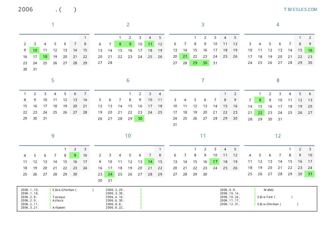 그레고리 안, 윤년이 아니다, 1 년에 365 일. 2006년 이란 21 공휴일 및 휴무 있습니다. 중국 동부 달력에서 2006 년은 개 년입니다. 연도는 일요일에 시작하여 일요일에 끝납니다.
