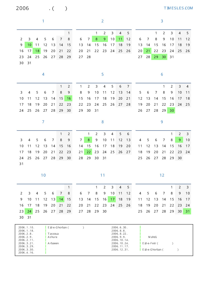 이란 2006 년 공휴일 및 주말이 포함 된 PDF 캘린더 다운로드 및 인쇄