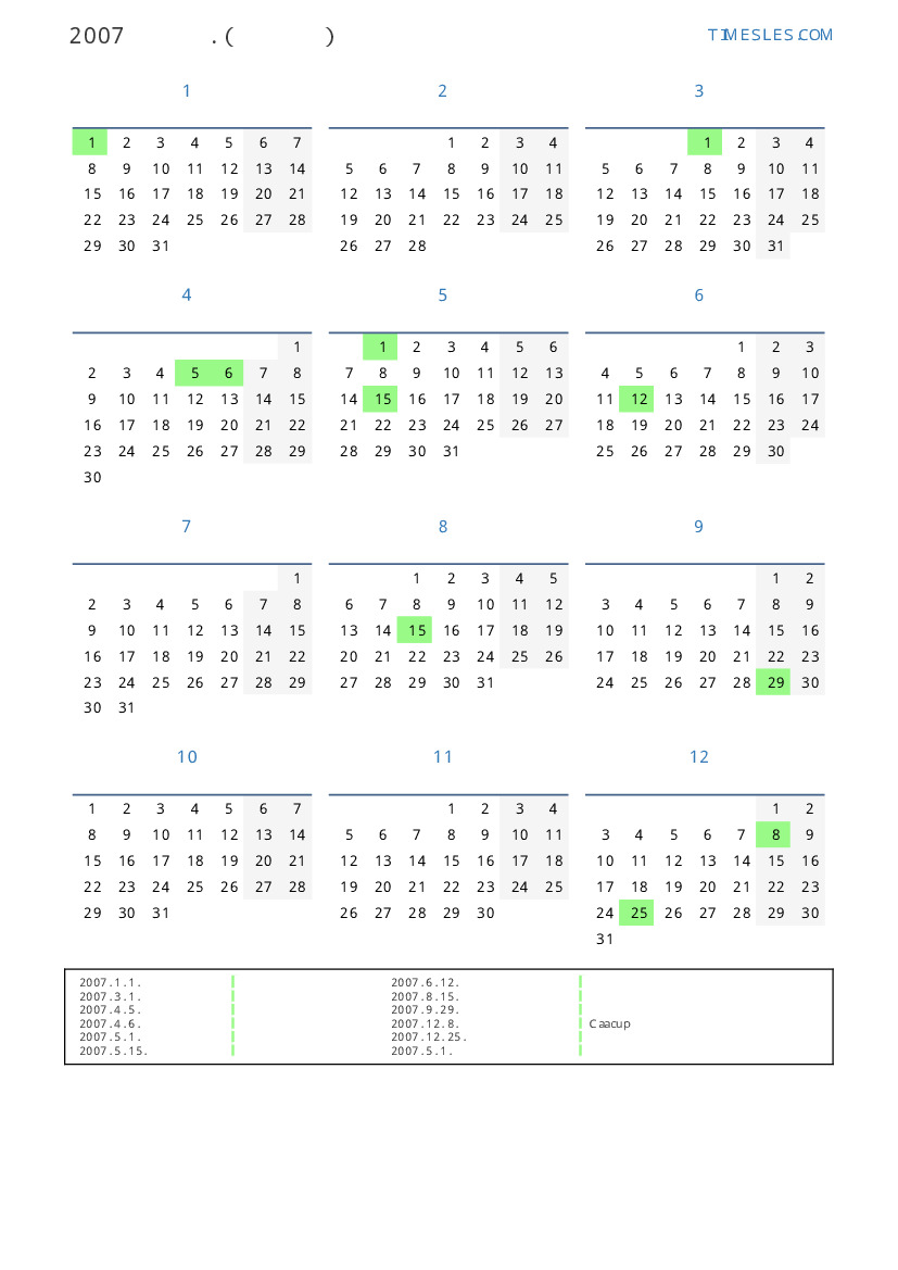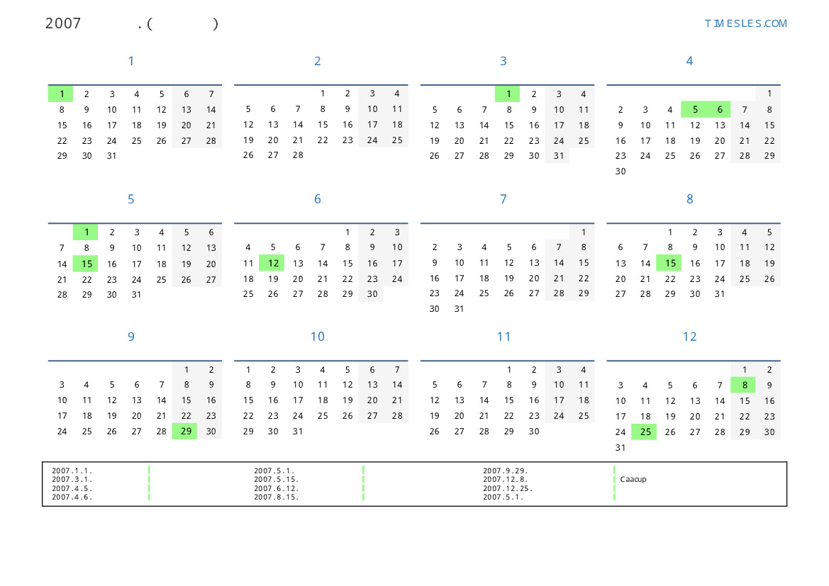 그레고리 안, 윤년이 아니다, 1 년에 365 일. 2007년 파라과이 18 공휴일 및 휴무 있습니다. 중국 동부 달력에서 2007 년은 돼지의 해입니다. 연도는 월요일에 시작하여 월요일에 끝납니다.